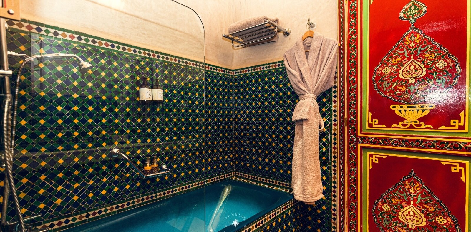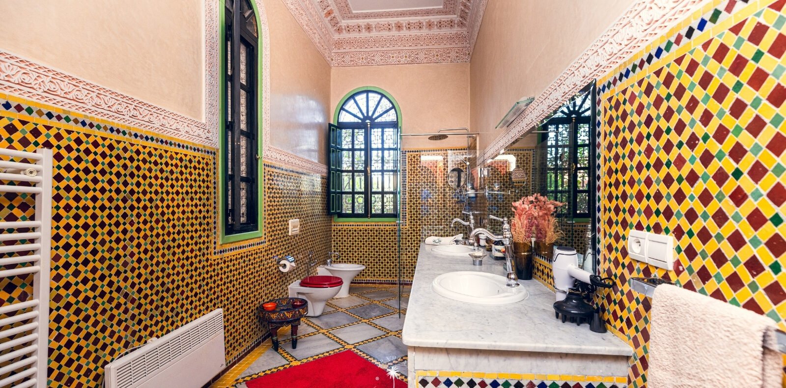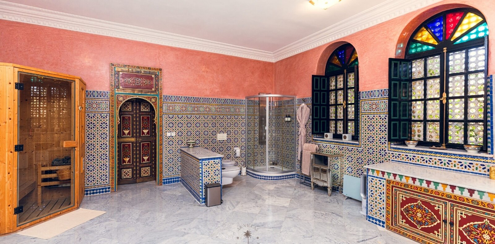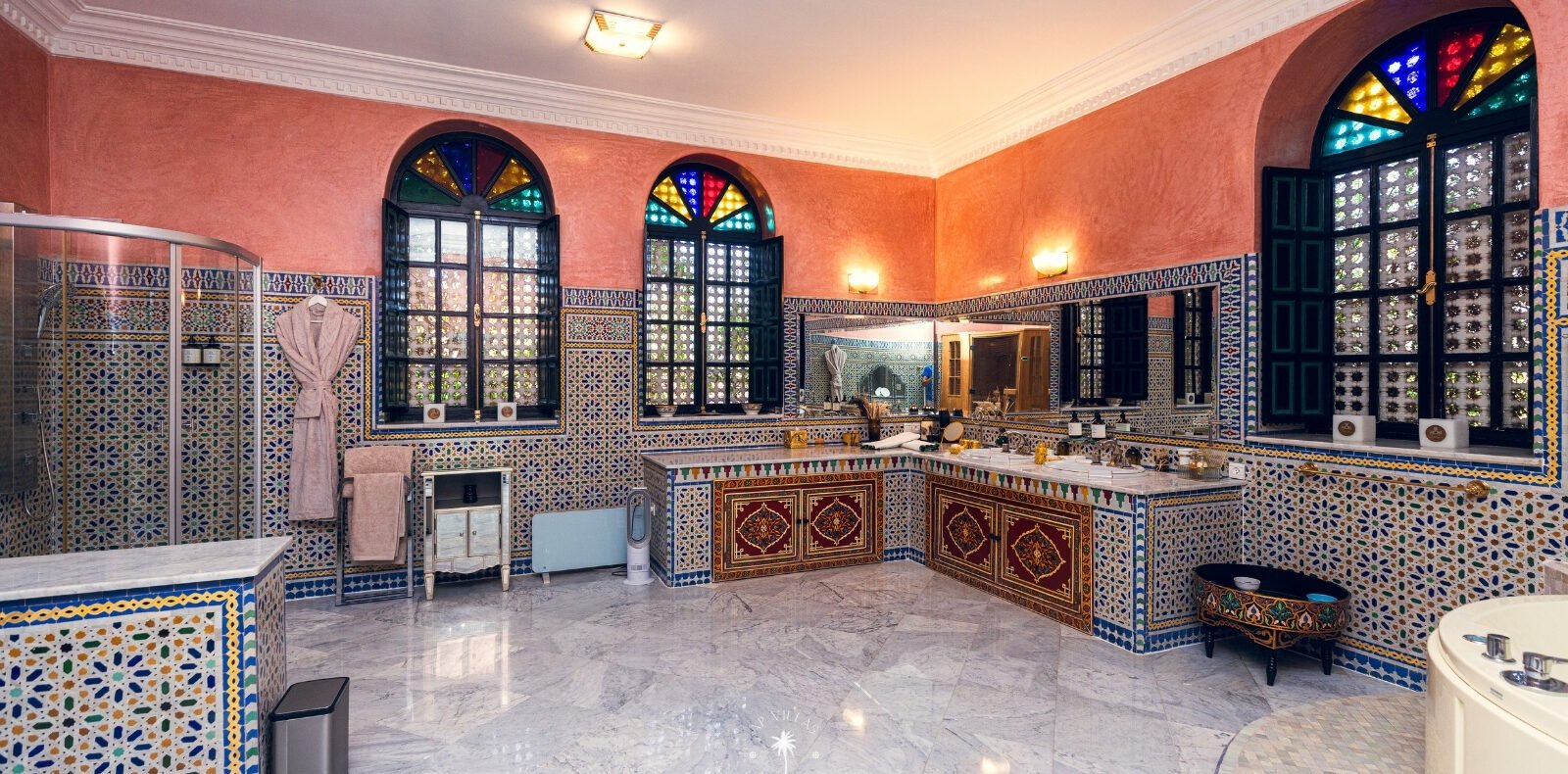 Entrez dans ce magnifique palais de style andalou, où chaque détail a été soigneusement conçu. Admirez la complexité des mosaïques en zellige, la splendeur des boiseries peintes à la main, et la grandeur des salons. Laissez-vous envoûter par l'élégance des suites et les jardins luxuriants qui entourent ce sanctuaire de raffinement.