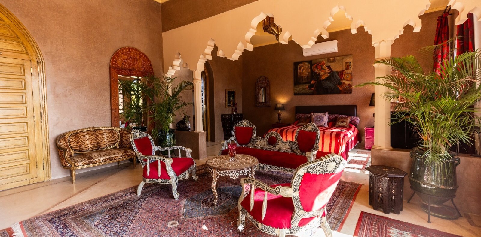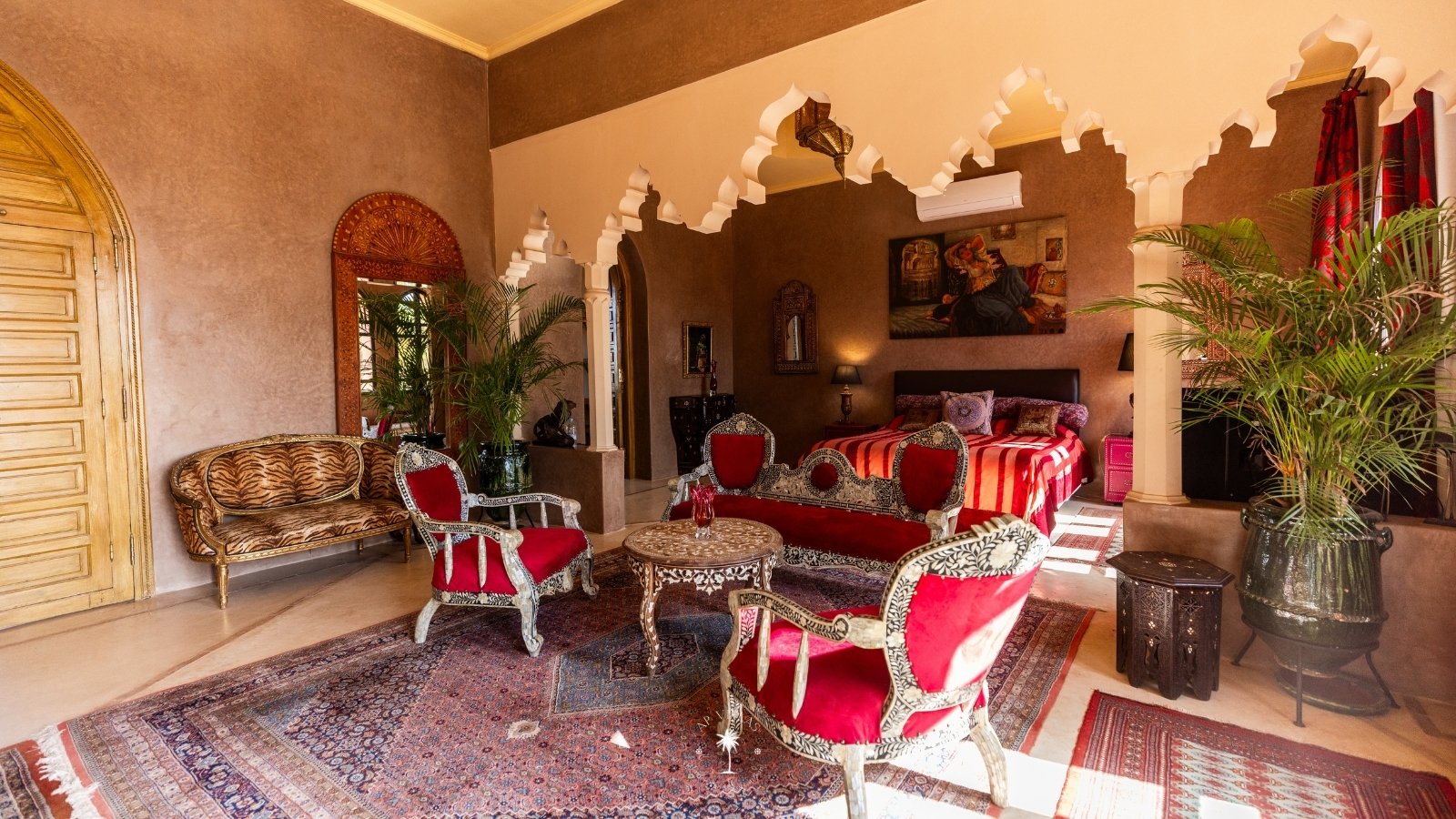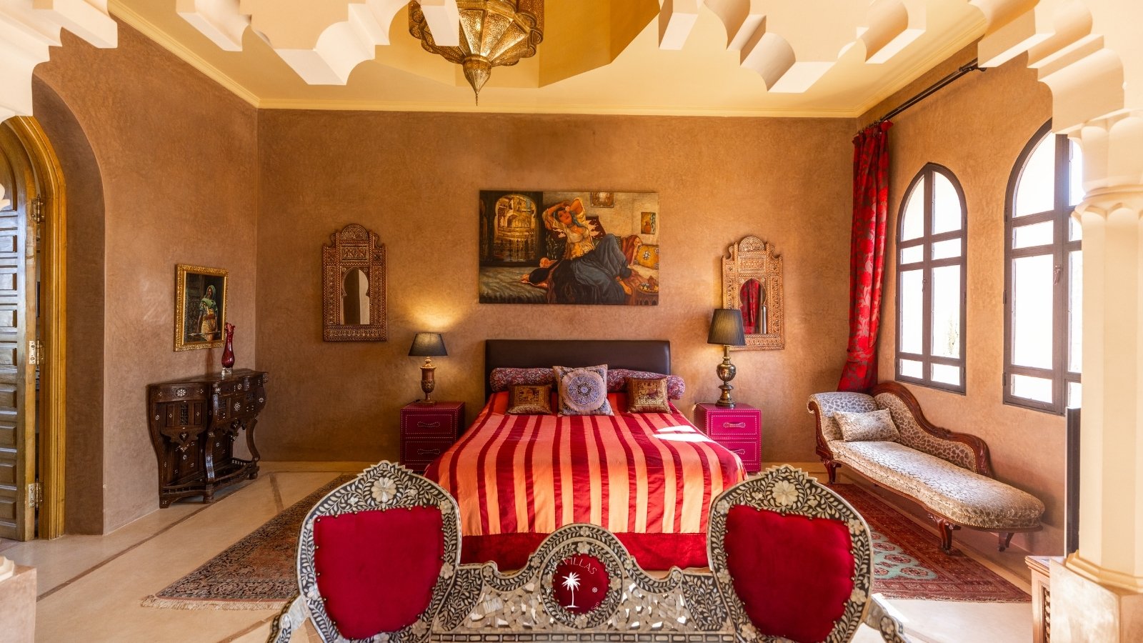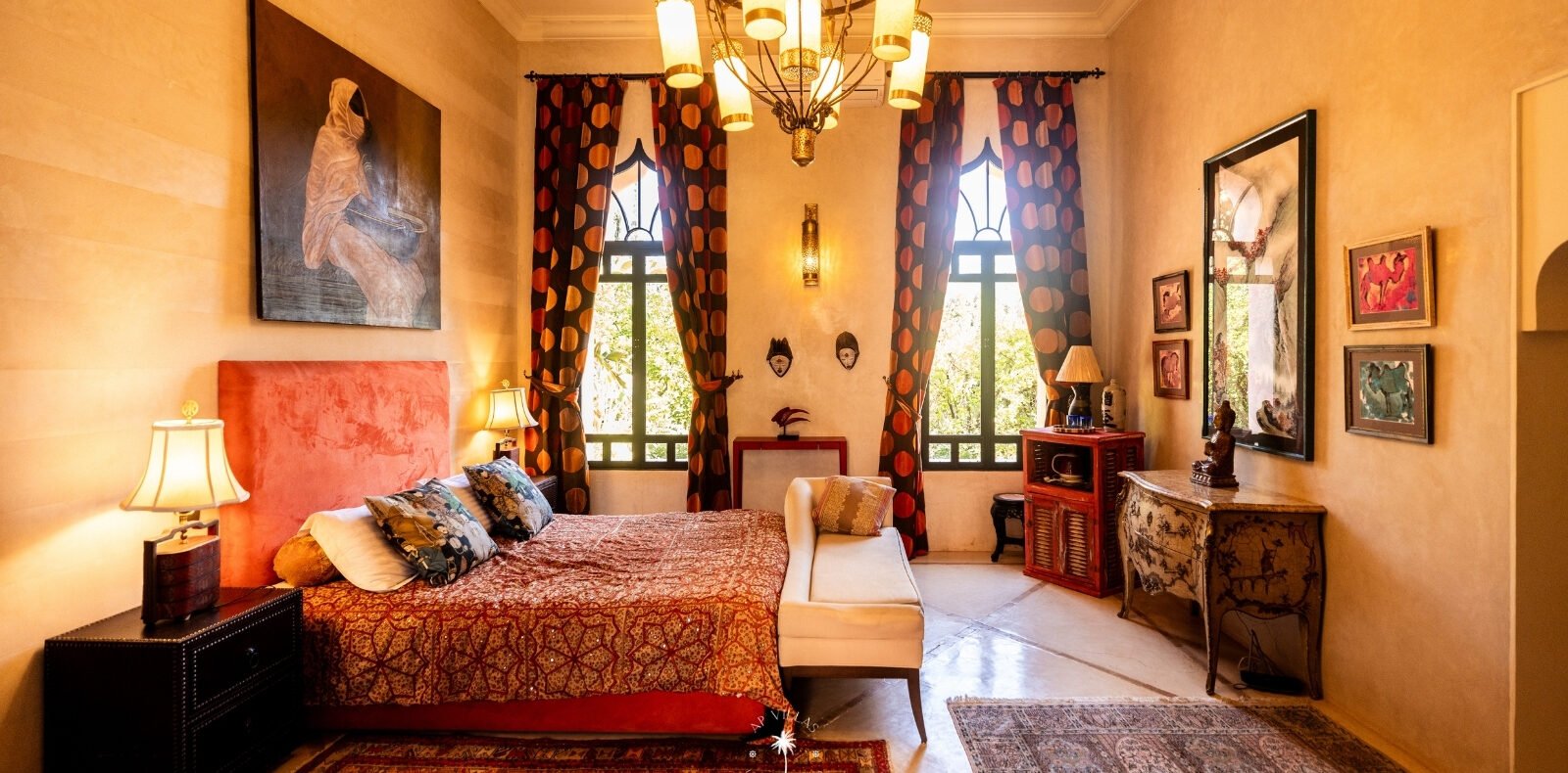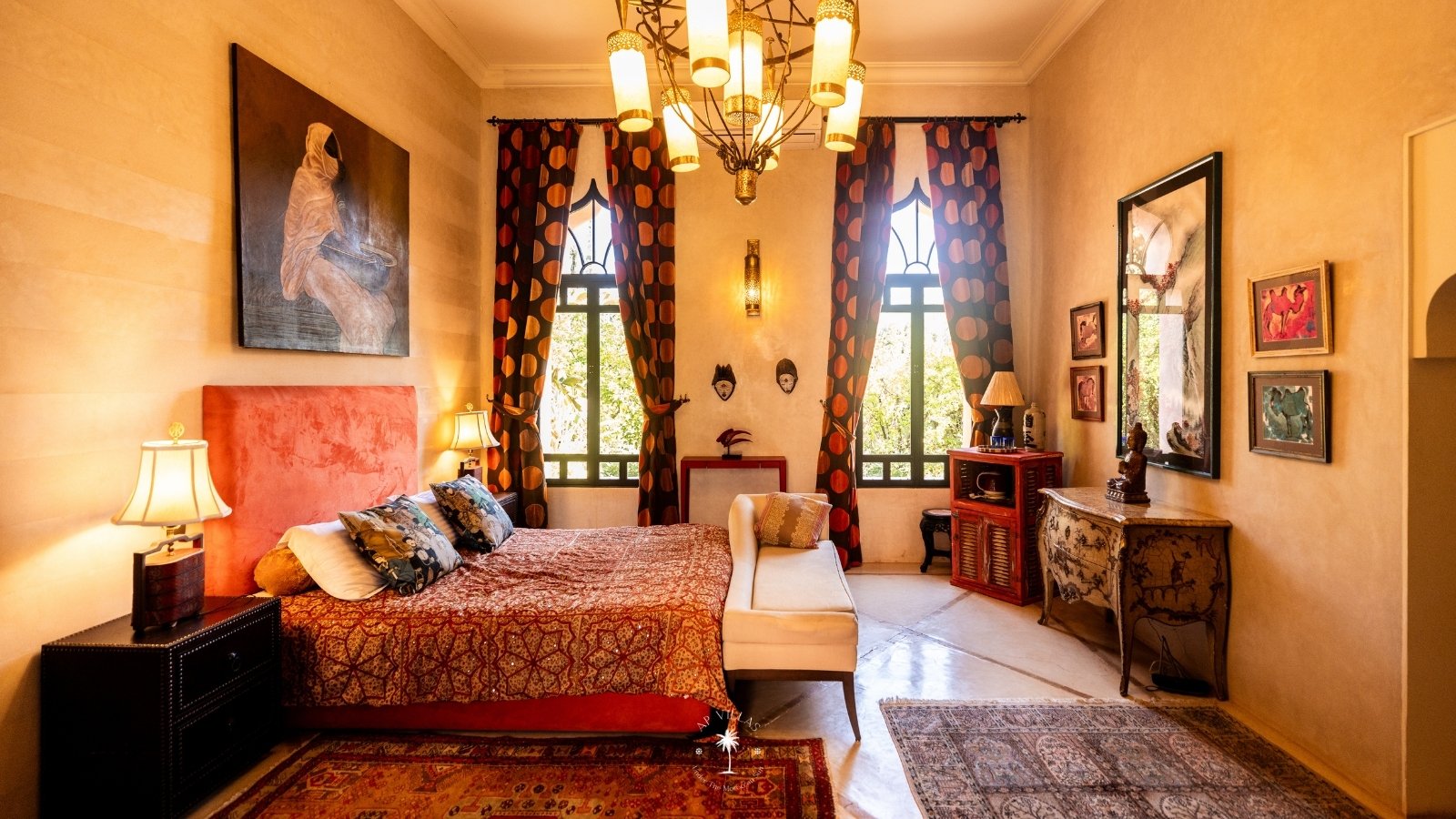 Ce magnifique palais s'étend sur deux niveaux et dispose de 9 suites spacieuses, chacune conçue pour offrir une atmosphère unique pour votre confort. Au premier étage, deux chambres principales dégagent une élégance et une sophistication remarquables.