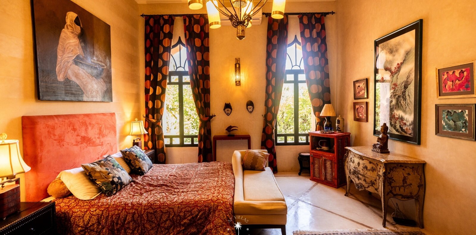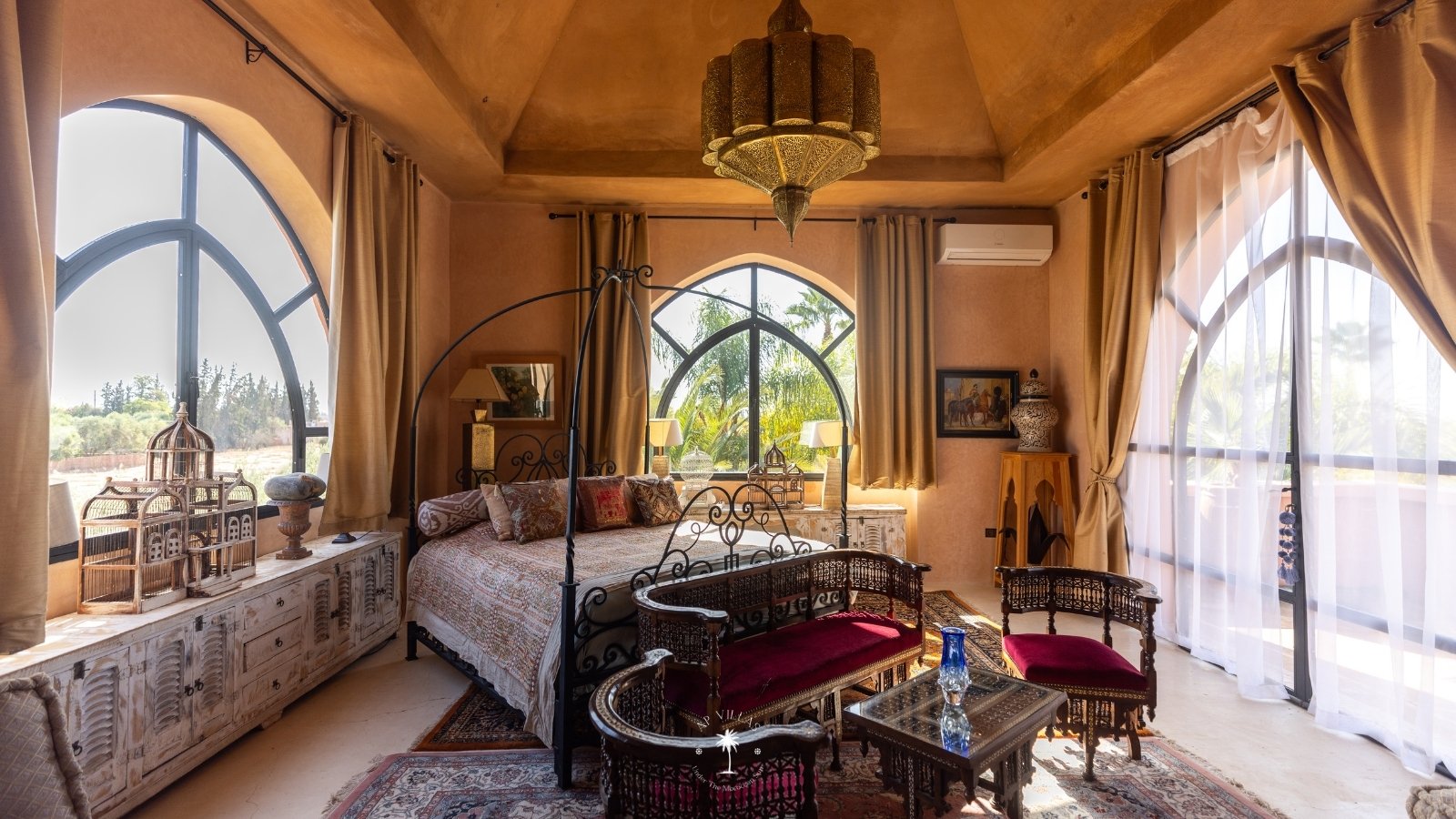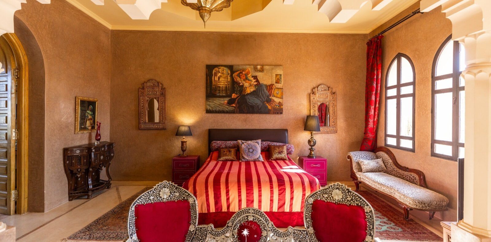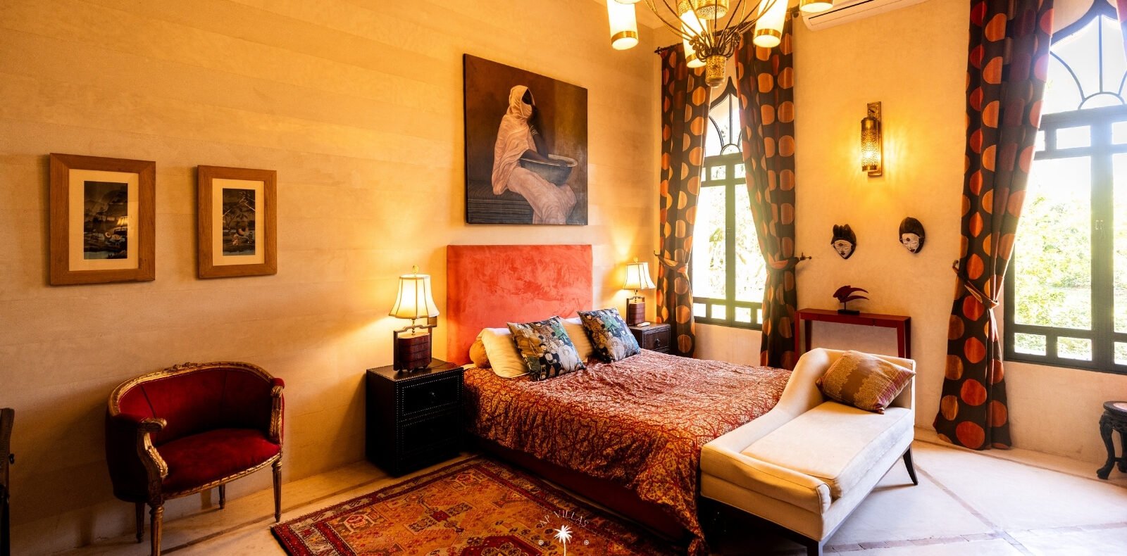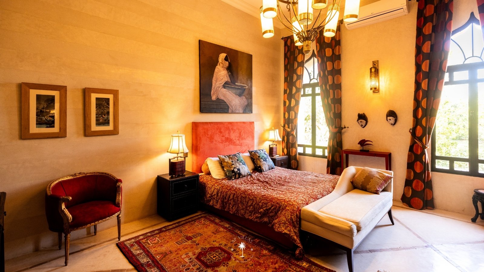 Ce magnifique palais s'étend sur deux niveaux et dispose de 9 suites spacieuses, chacune conçue pour offrir une atmosphère unique pour votre confort. Au premier étage, deux chambres principales dégagent une élégance et une sophistication remarquables.