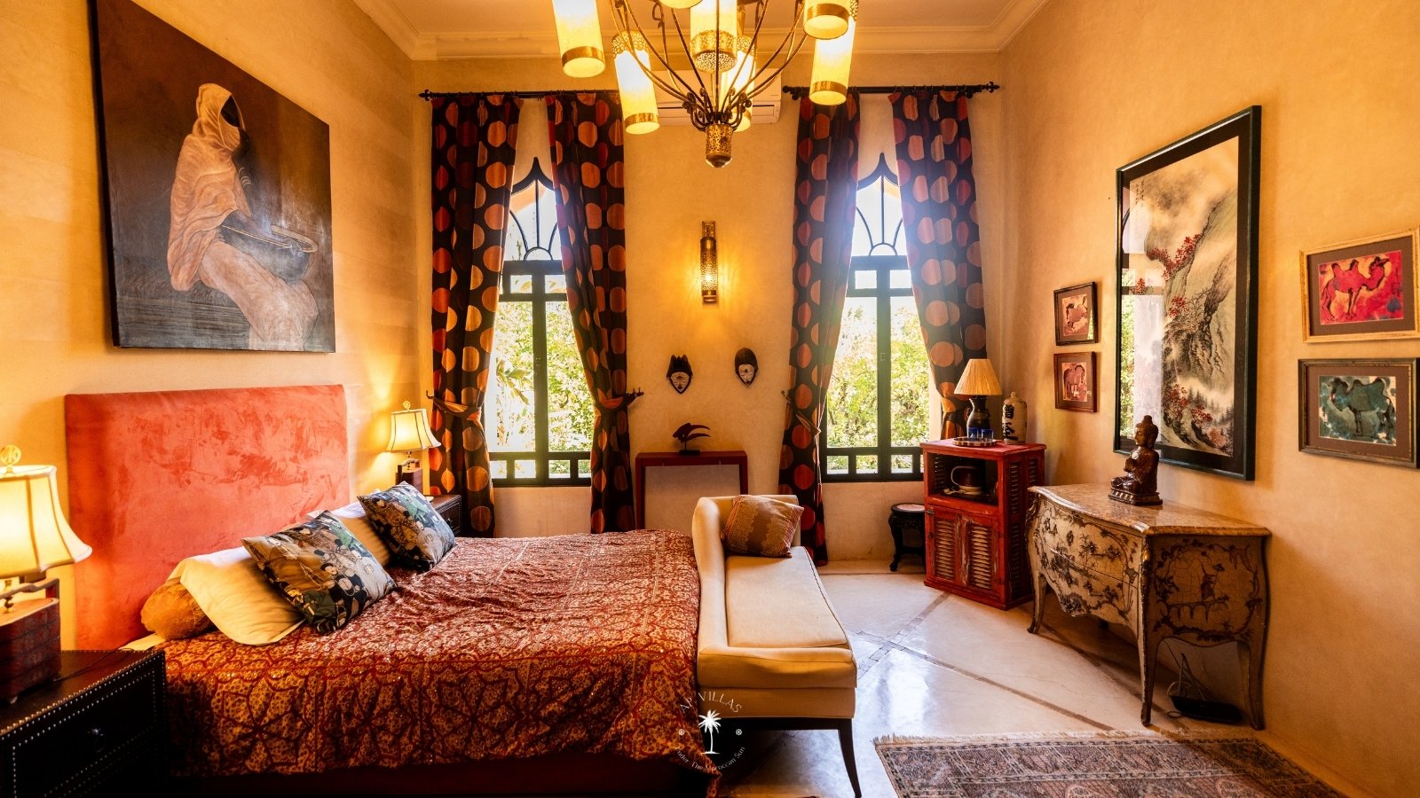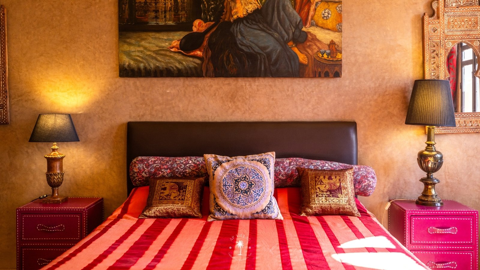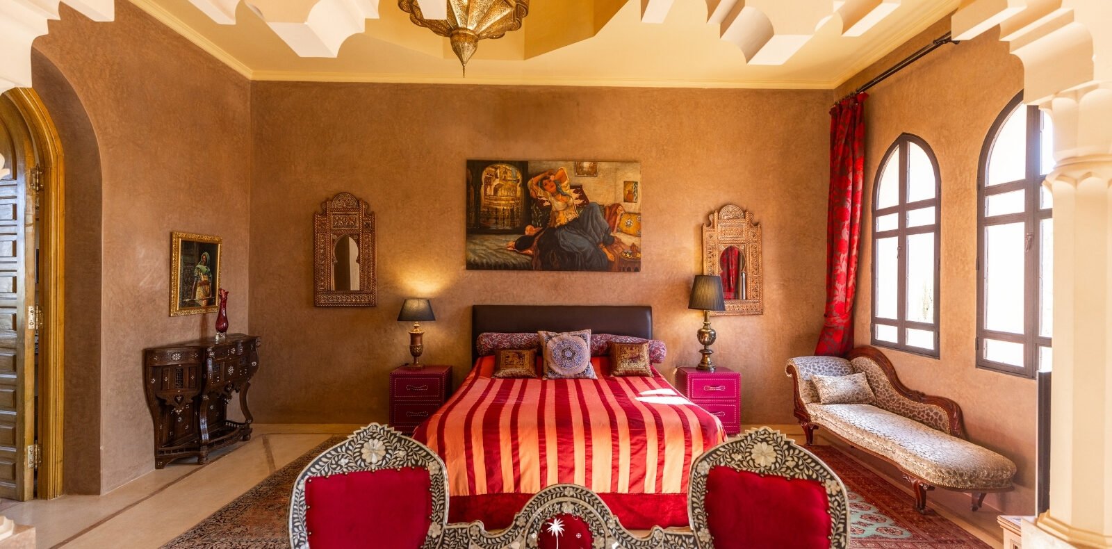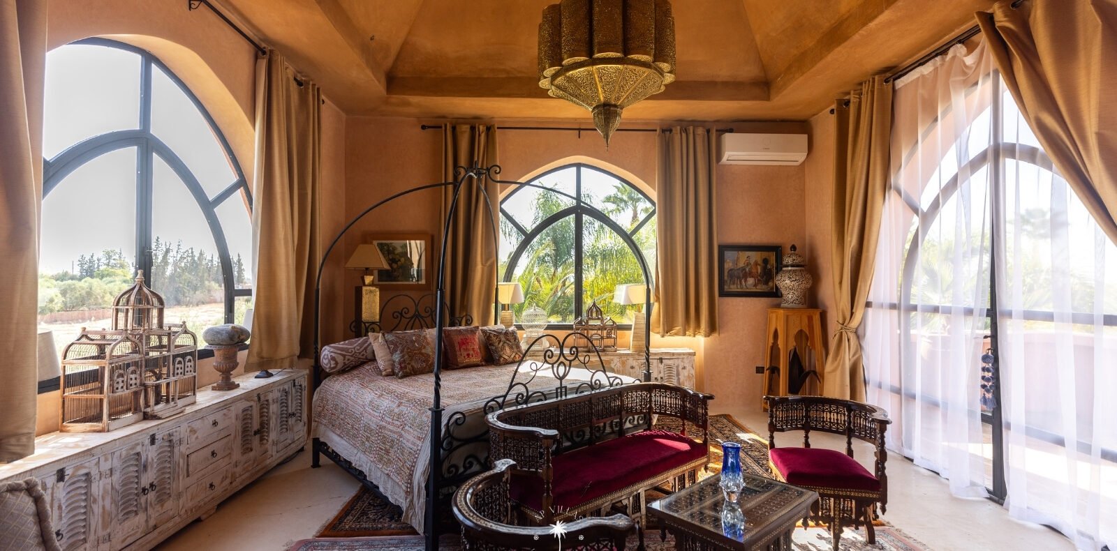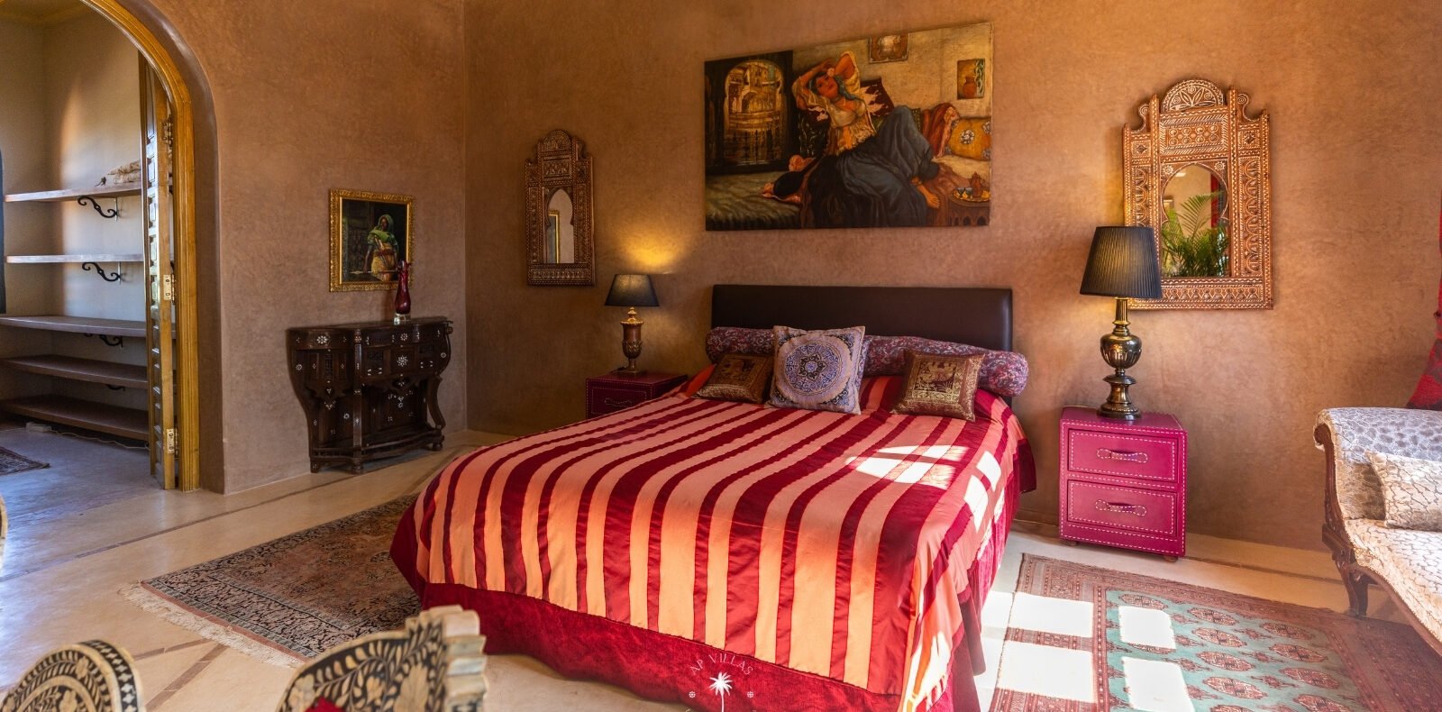 Ce magnifique palais s'étend sur deux niveaux et dispose de 9 suites spacieuses, chacune conçue pour offrir une atmosphère unique pour votre confort. Au premier étage, deux chambres principales dégagent une élégance et une sophistication remarquables.