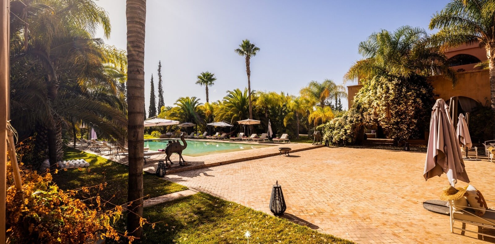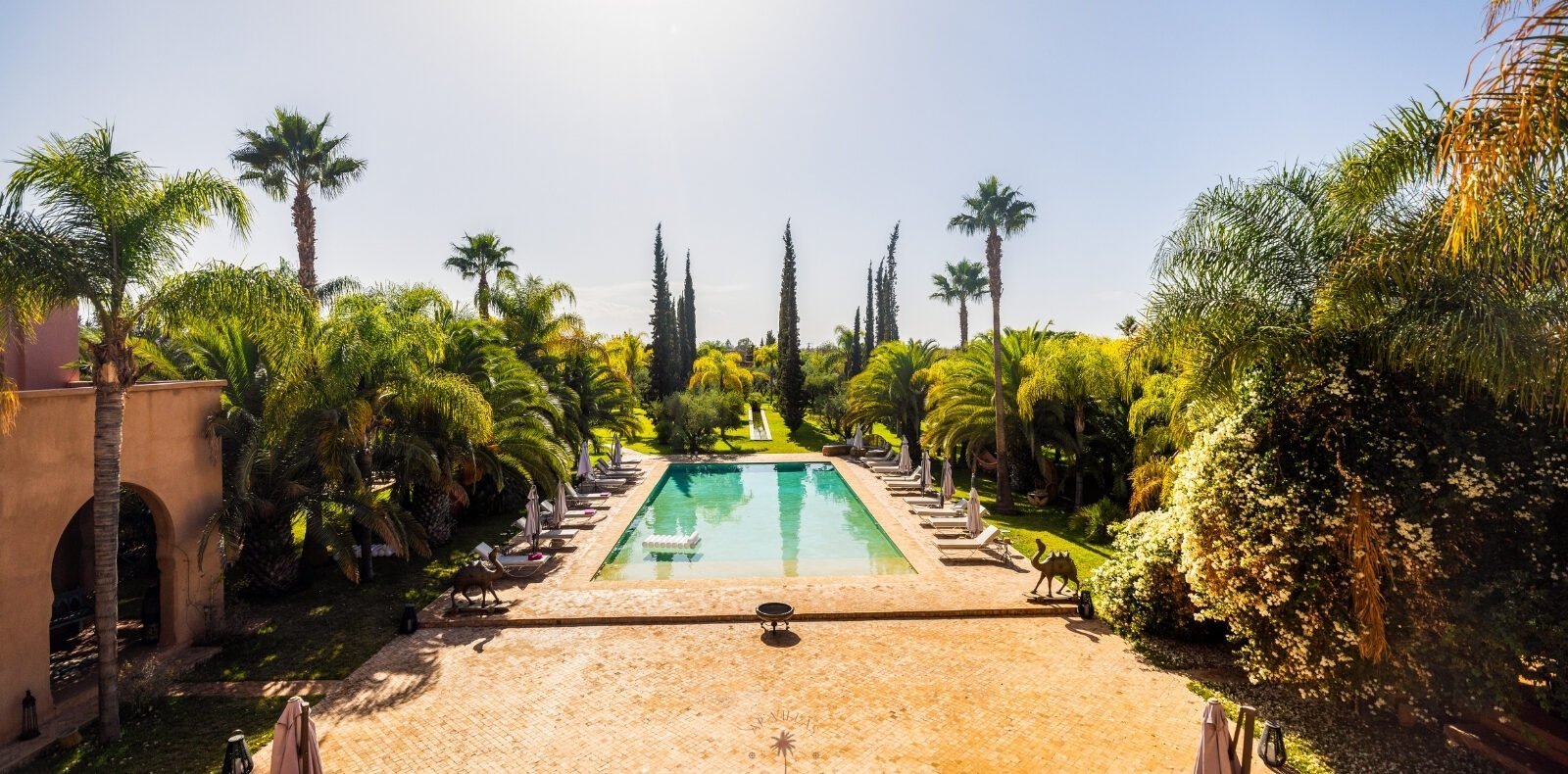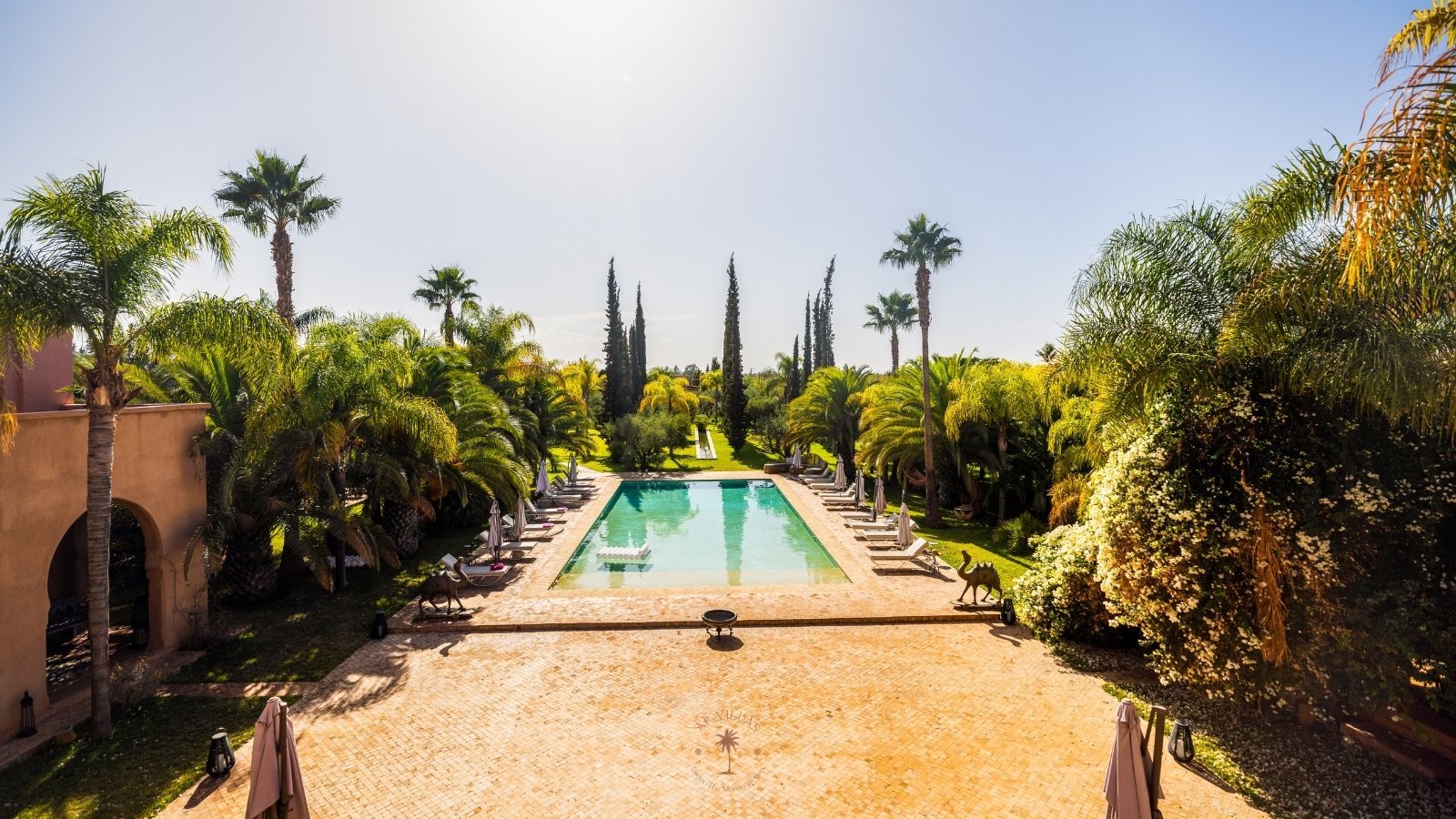 Sortez pour découvrir une piscine spacieuse de 180 m², idéale pour se détendre sous le soleil de Marrakech.
