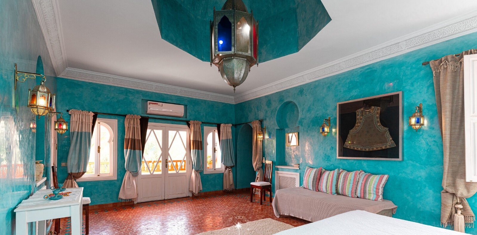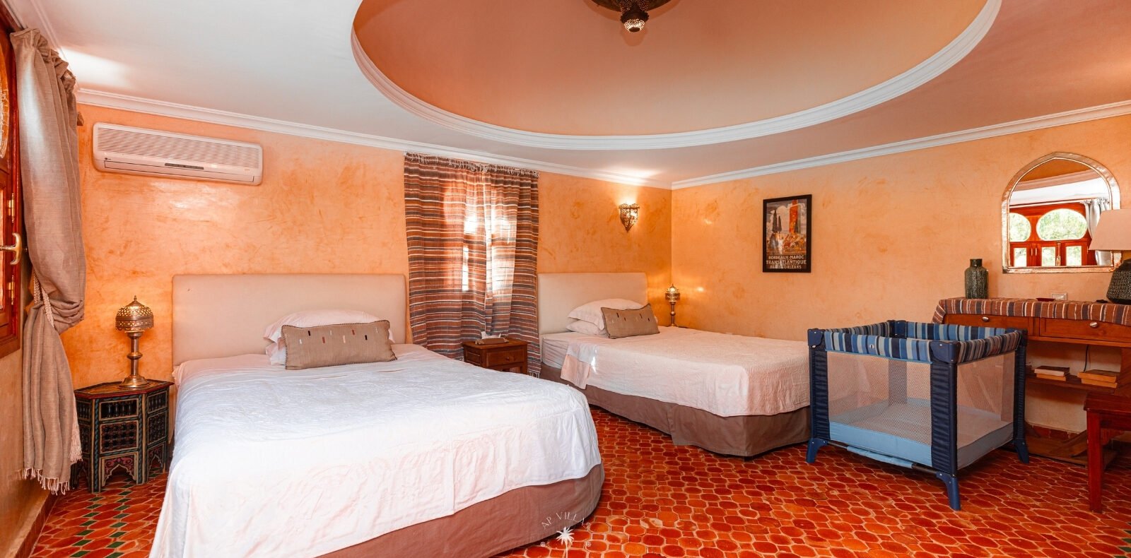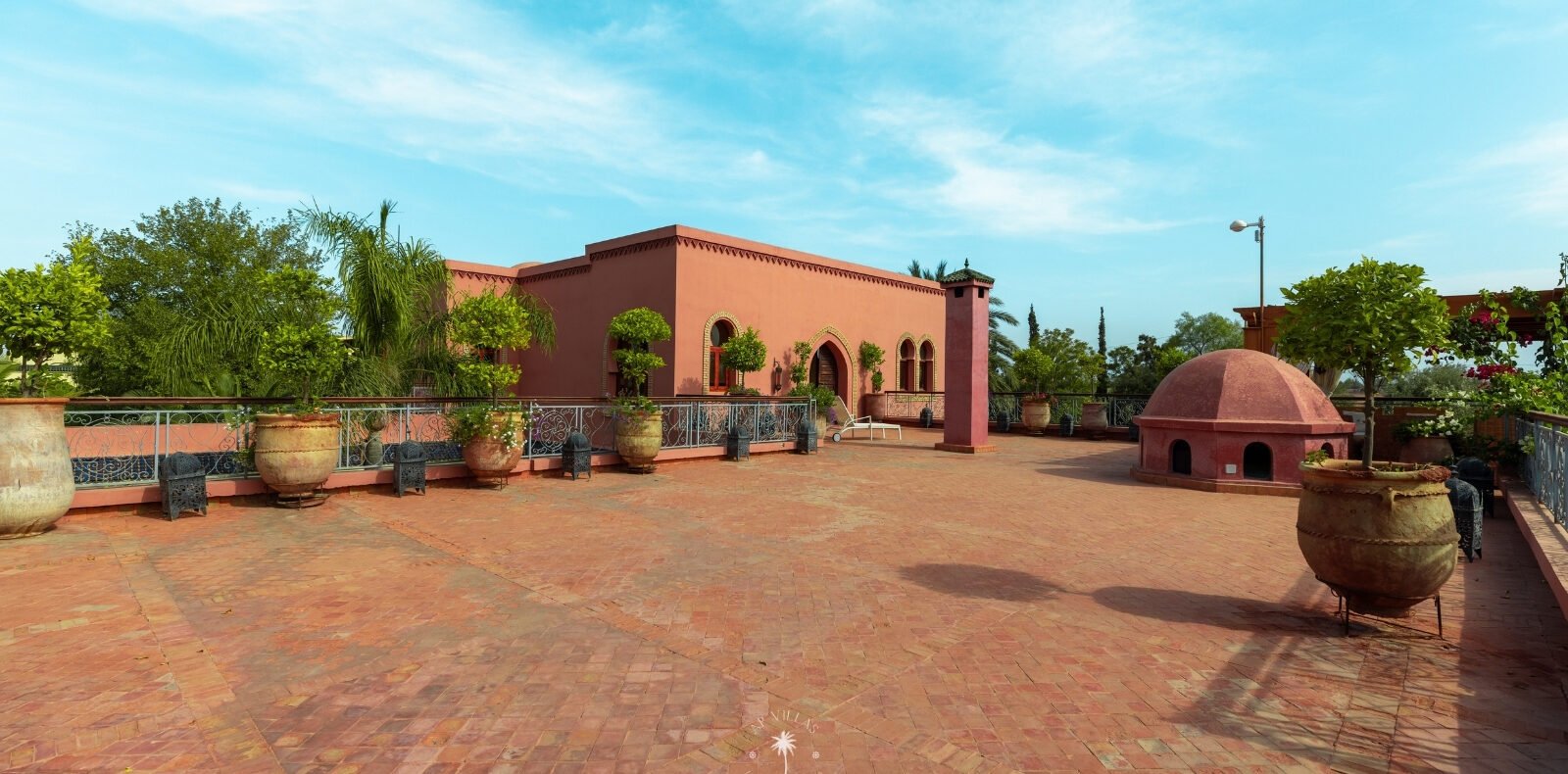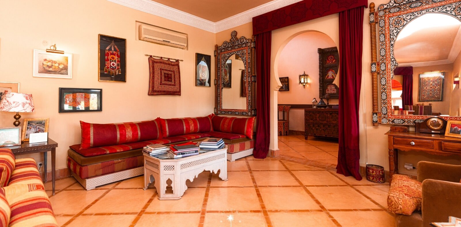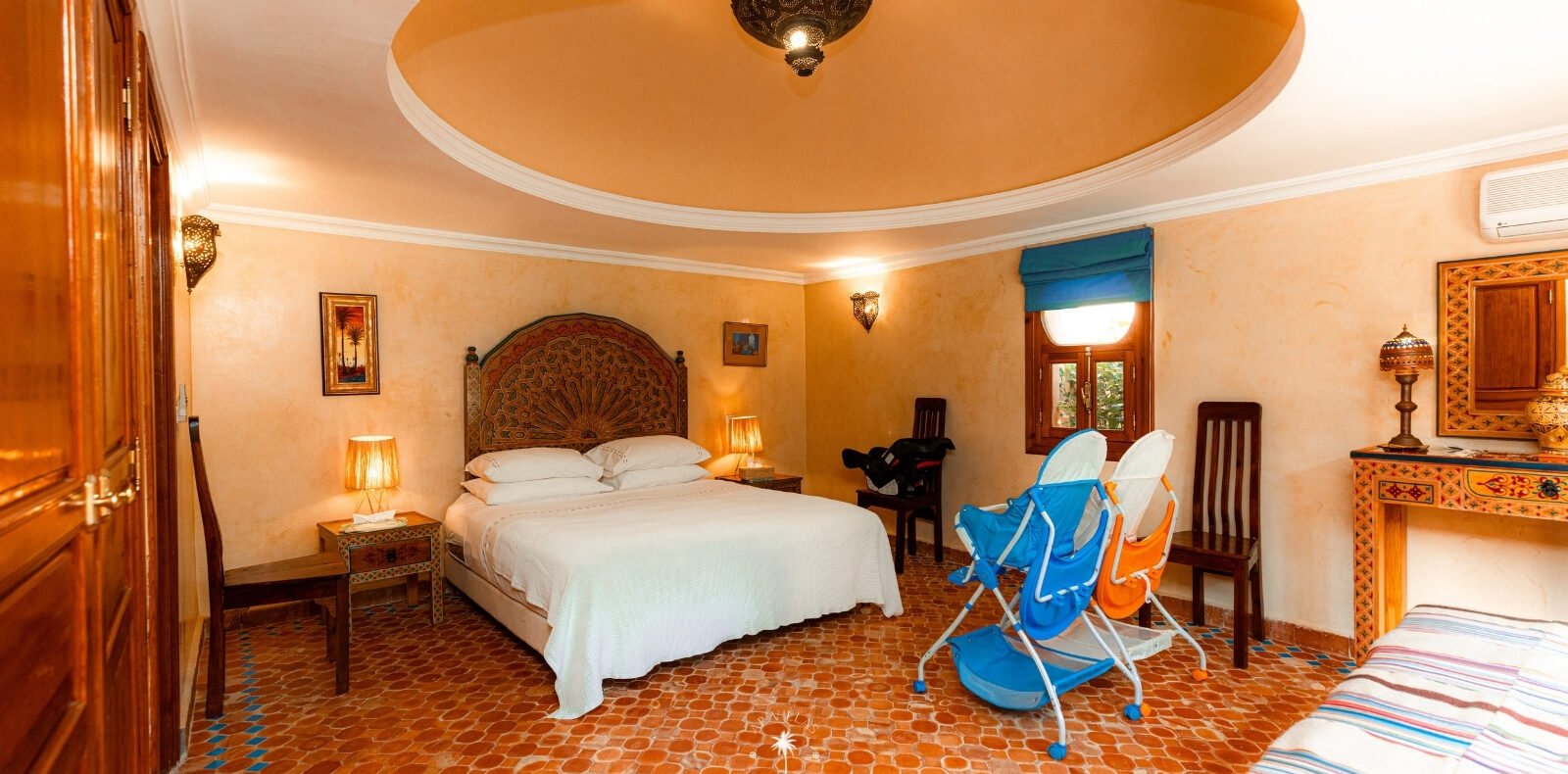 Les chambres charmantes et colorées sont situées soit au rez-de-chaussée de la villa, soit dans le Pavillon voisin, à seulement quelques pas. Montez l’impressionnant escalier illuminé, sous un remarquable dôme oblong ajouré, pour découvrir la salle multimédia équipée d’un bar. Cet espace s’ouvre sur une terrasse supérieure aménagée avec des sièges de style marocain et ombragée par une pergola, offrant une vue imprenable sur les jardins et les sommets enneigés de l’Atlas—un lieu idyllique pour savourer un apéritif avant le dîner.