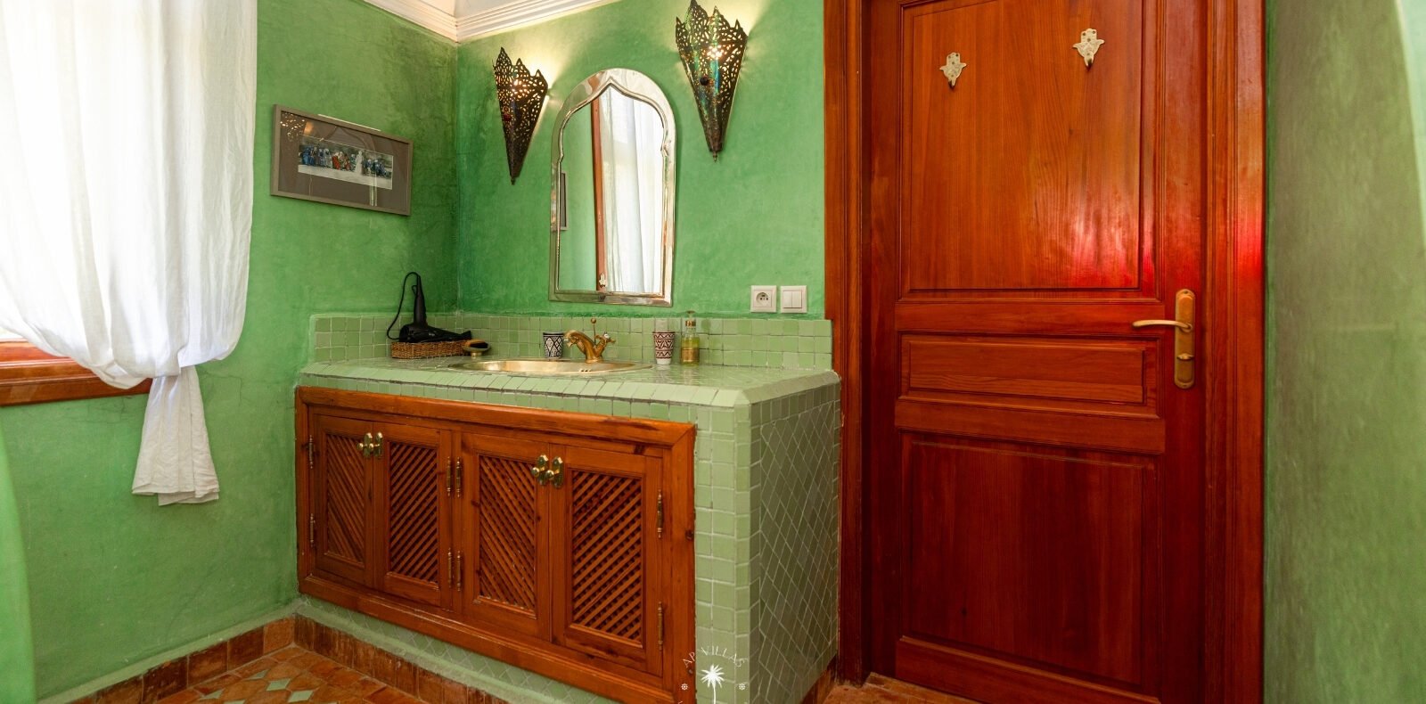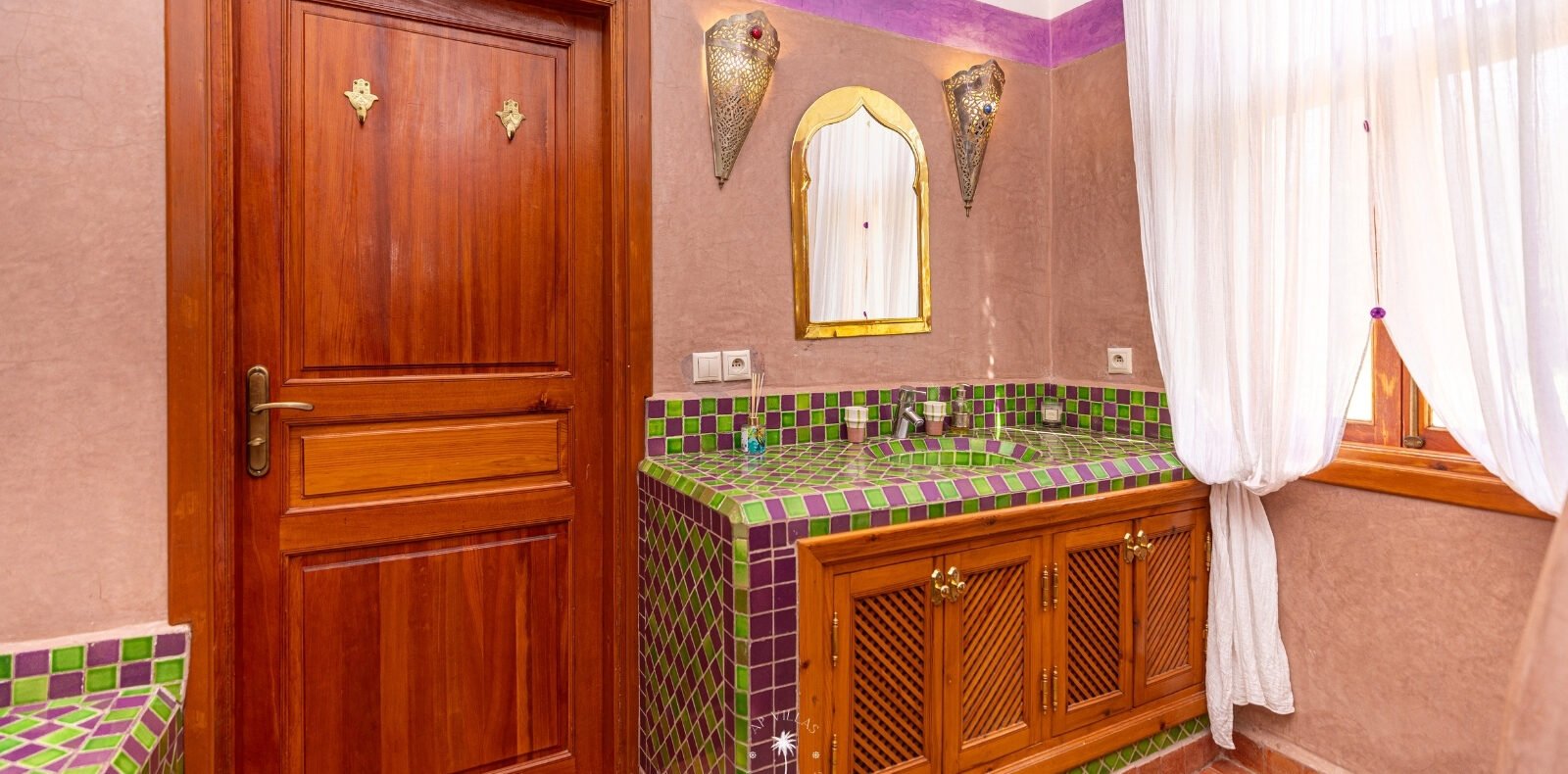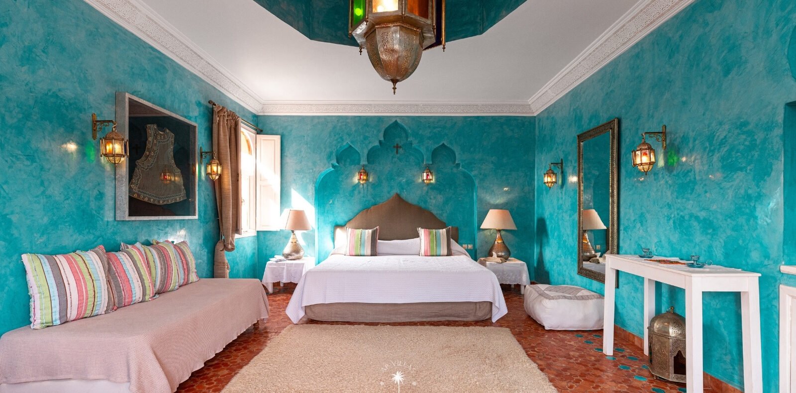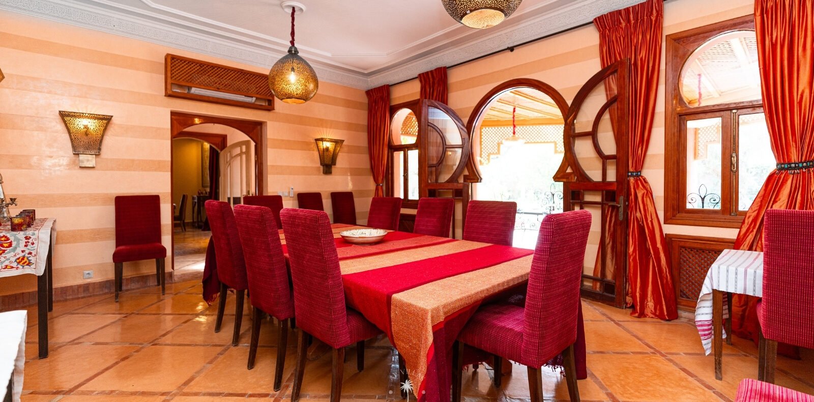 Les chambres charmantes et colorées sont situées soit au rez-de-chaussée de la villa, soit dans le Pavillon voisin, à seulement quelques pas. Montez l’impressionnant escalier illuminé, sous un remarquable dôme oblong ajouré, pour découvrir la salle multimédia équipée d’un bar. Cet espace s’ouvre sur une terrasse supérieure aménagée avec des sièges de style marocain et ombragée par une pergola, offrant une vue imprenable sur les jardins et les sommets enneigés de l’Atlas—un lieu idyllique pour savourer un apéritif avant le dîner.