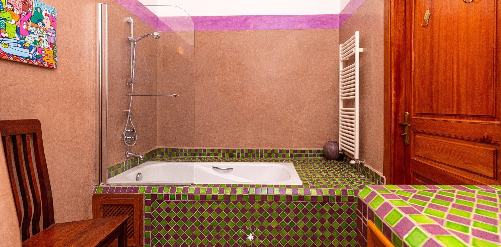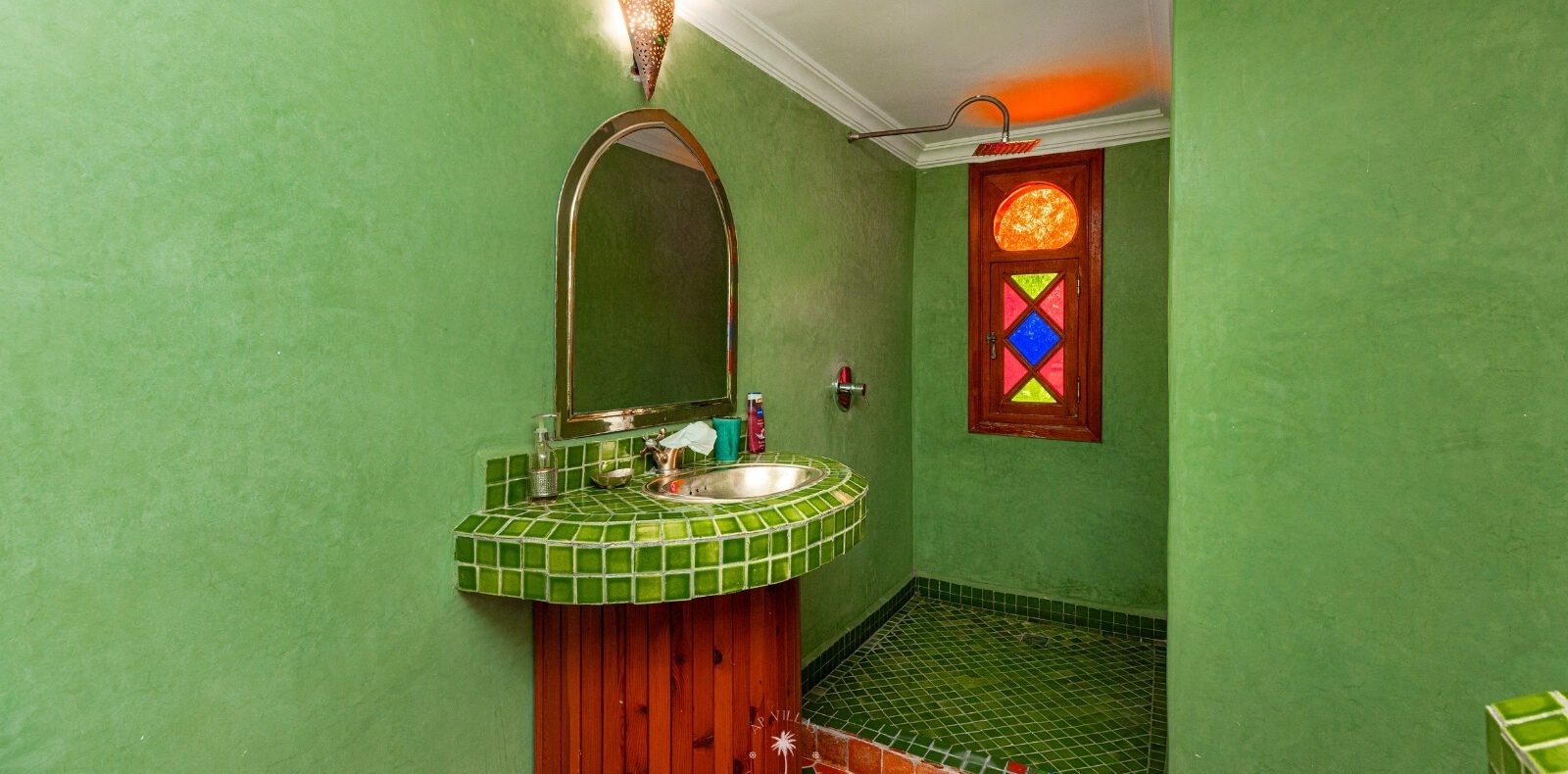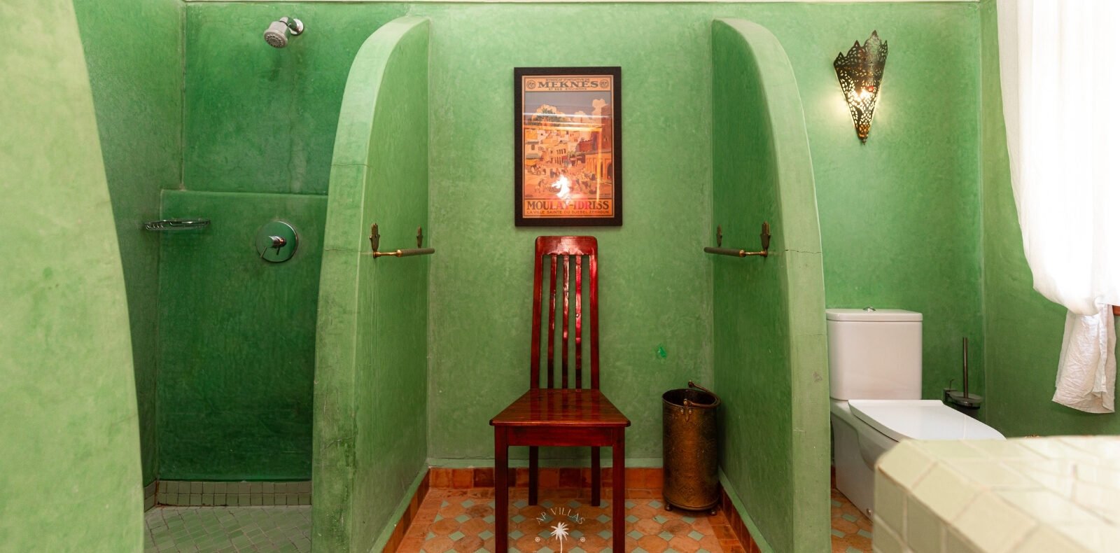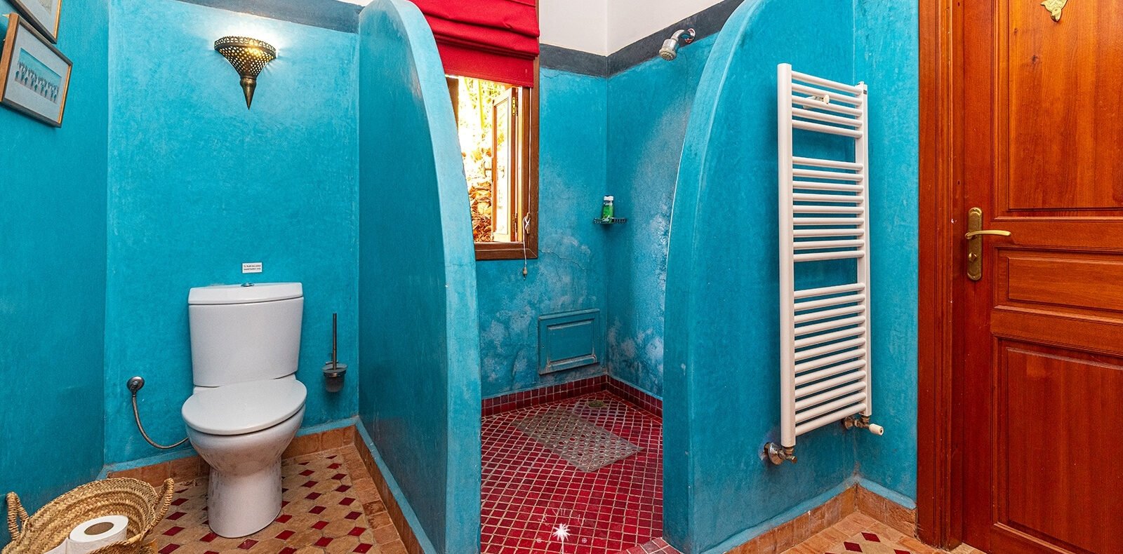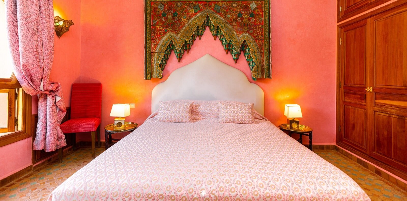 Les chambres charmantes et colorées sont situées soit au rez-de-chaussée de la villa, soit dans le Pavillon voisin, à seulement quelques pas. Montez l’impressionnant escalier illuminé, sous un remarquable dôme oblong ajouré, pour découvrir la salle multimédia équipée d’un bar. Cet espace s’ouvre sur une terrasse supérieure aménagée avec des sièges de style marocain et ombragée par une pergola, offrant une vue imprenable sur les jardins et les sommets enneigés de l’Atlas—un lieu idyllique pour savourer un apéritif avant le dîner.