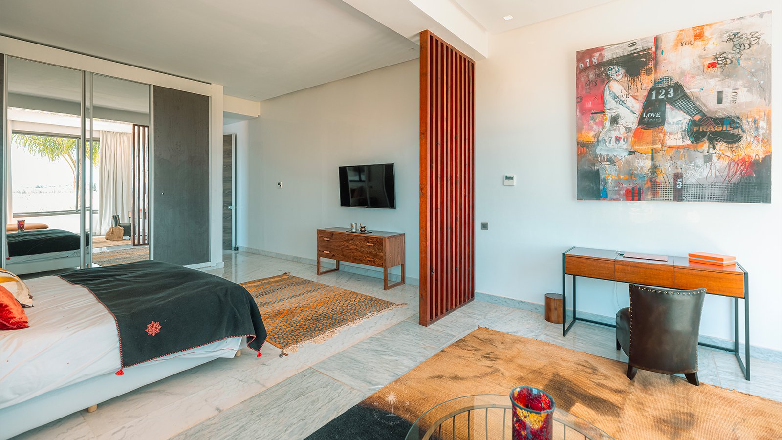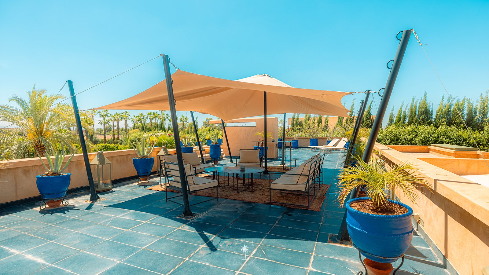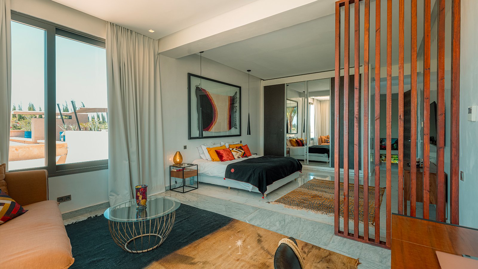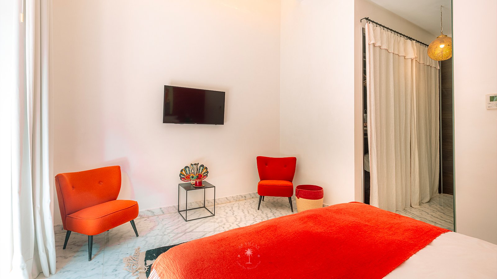 On the upper floor, the master suite becomes a true sanctuary. With its spacious dressing room, private bathroom, TV, and a superb terrace, it invites you to unwind while admiring panoramic views of the Atlas Mountains, perfect for quiet contemplation or a sunset aperitif.
