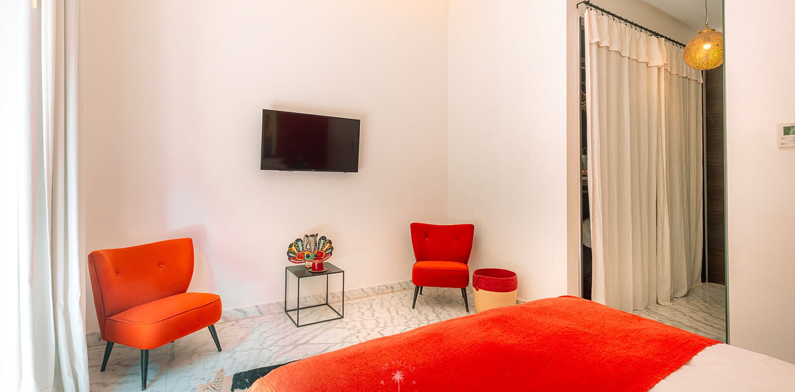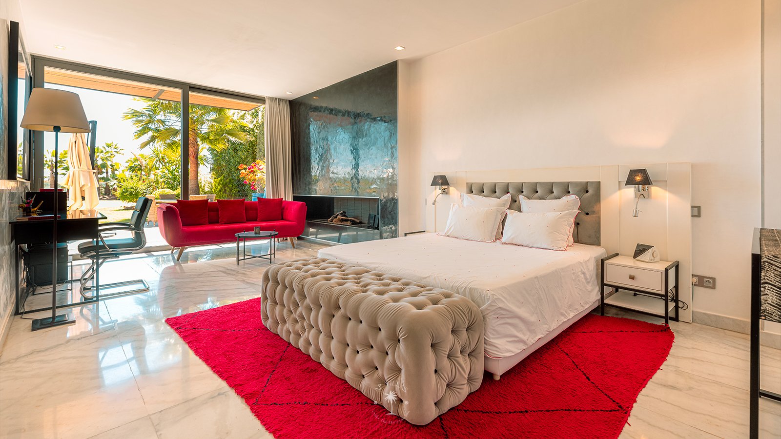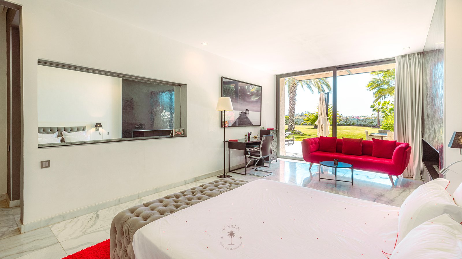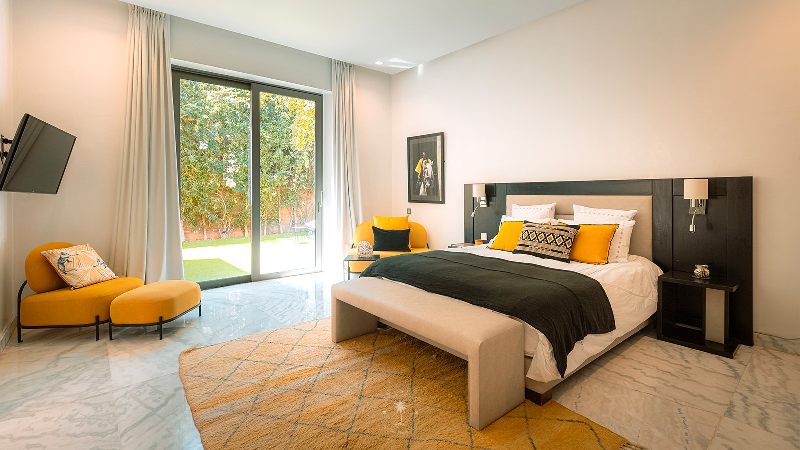 On the upper floor, the master suite becomes a true sanctuary. With its spacious dressing room, private bathroom, TV, and a superb terrace, it invites you to unwind while admiring panoramic views of the Atlas Mountains, perfect for quiet contemplation or a sunset aperitif.