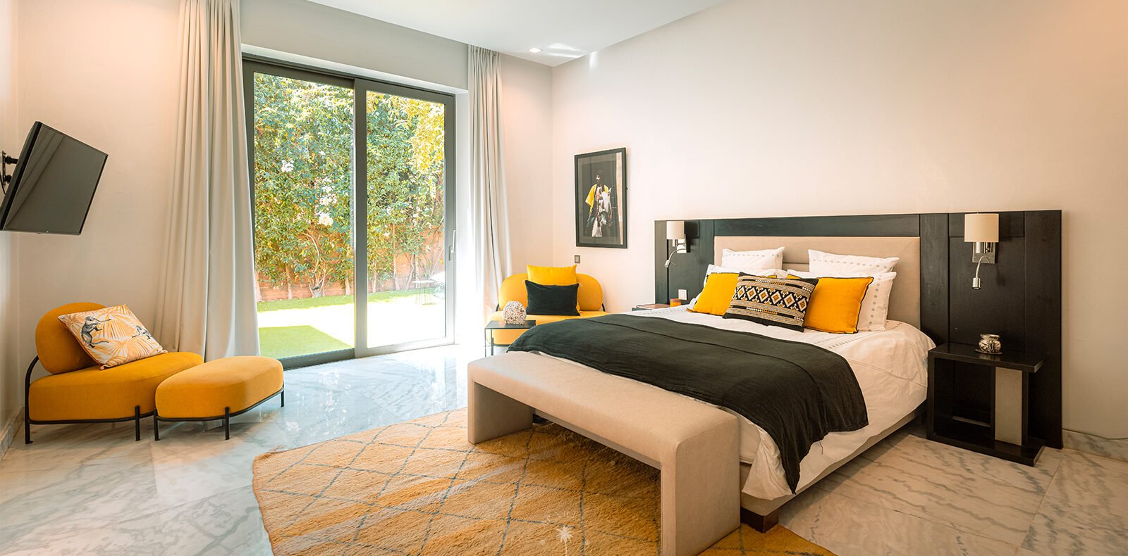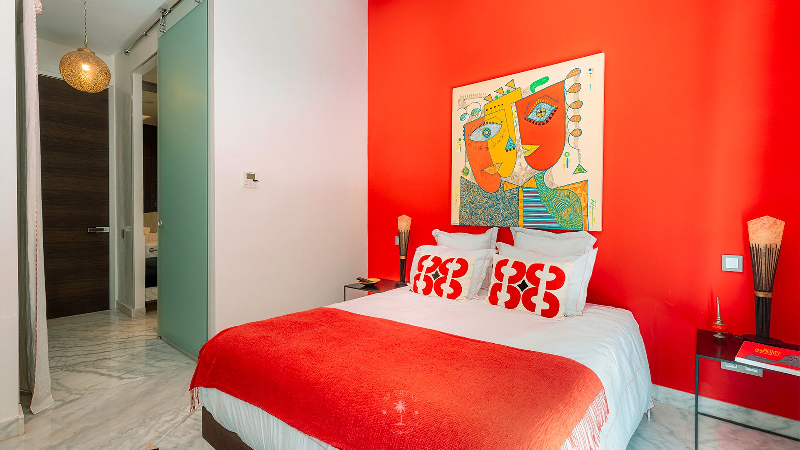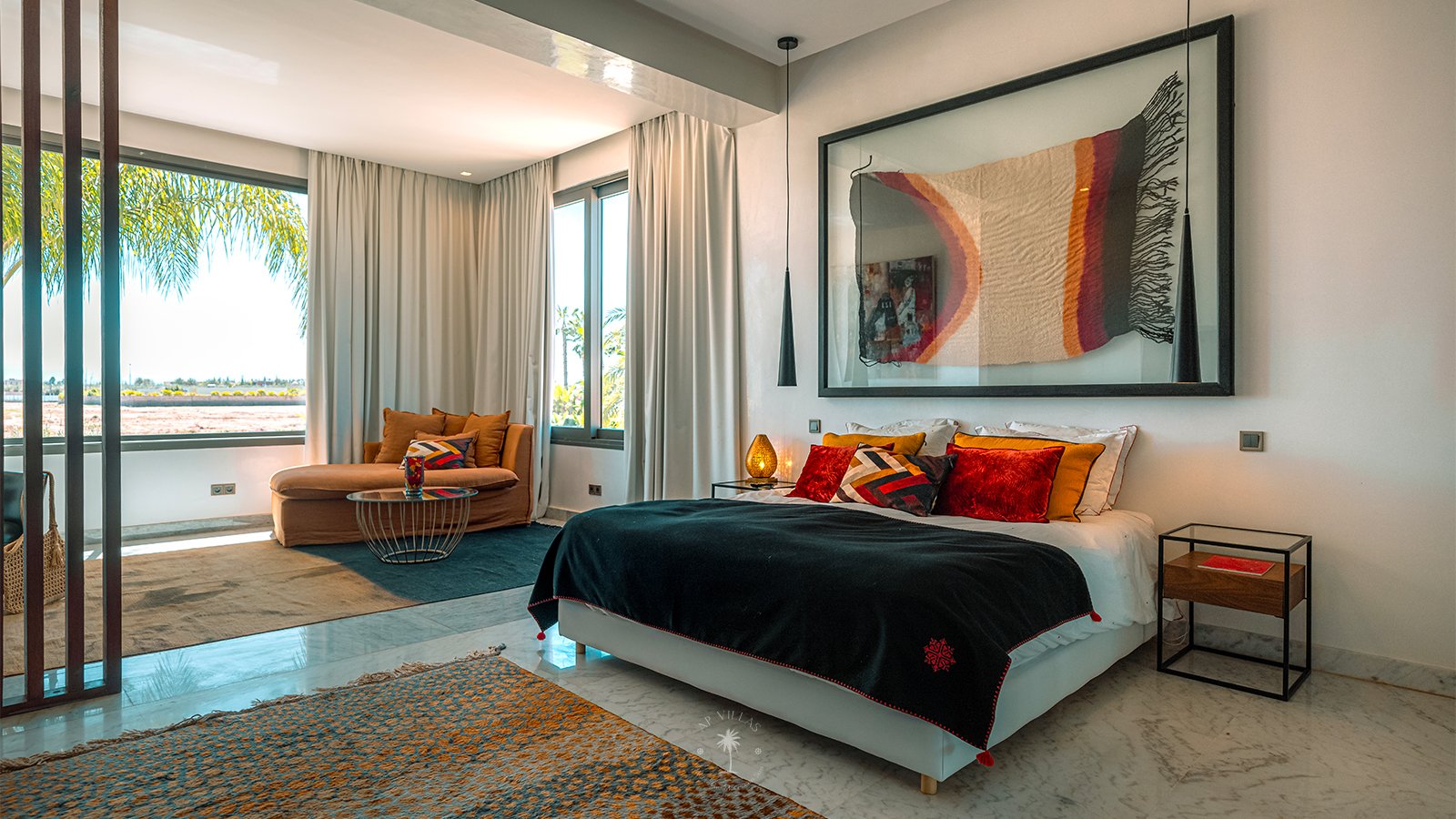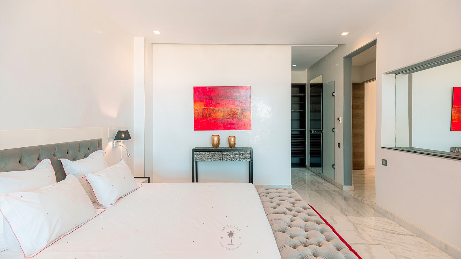 On the upper floor, the master suite becomes a true sanctuary. With its spacious dressing room, private bathroom, TV, and a superb terrace, it invites you to unwind while admiring panoramic views of the Atlas Mountains, perfect for quiet contemplation or a sunset aperitif.