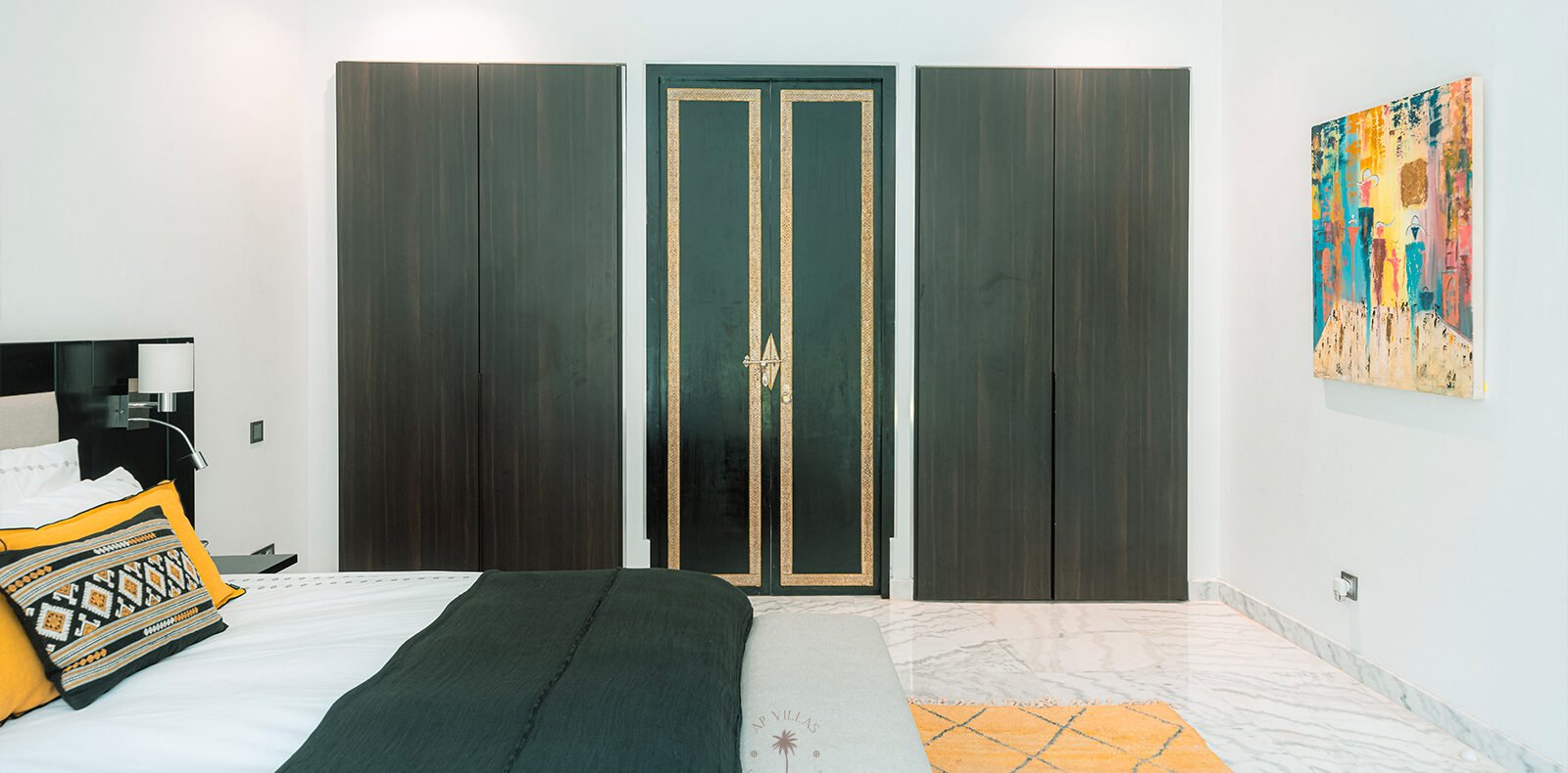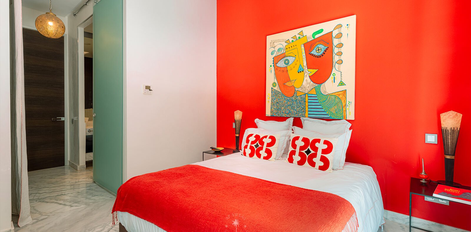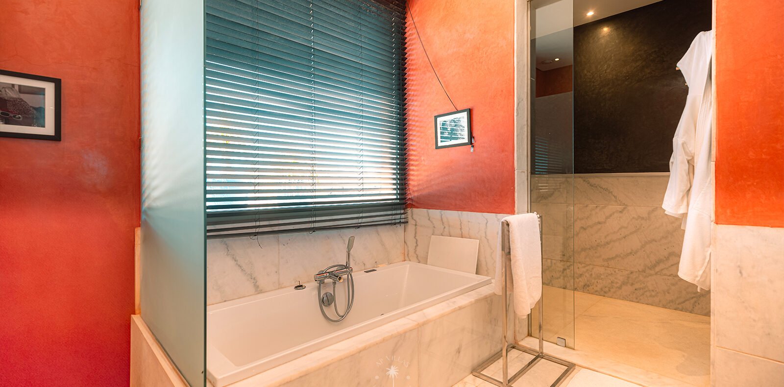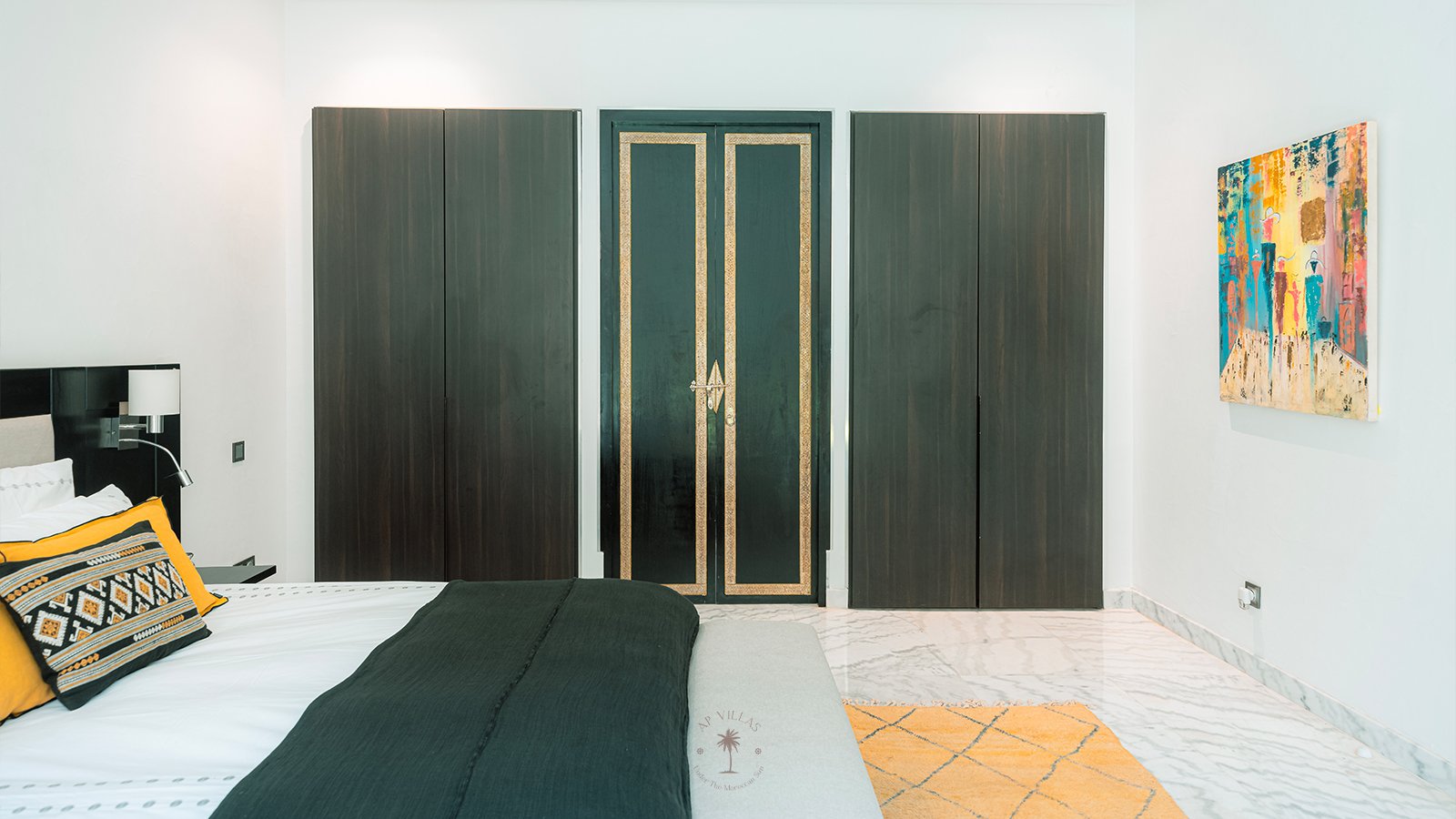 On the upper floor, the master suite becomes a true sanctuary. With its spacious dressing room, private bathroom, TV, and a superb terrace, it invites you to unwind while admiring panoramic views of the Atlas Mountains, perfect for quiet contemplation or a sunset aperitif.