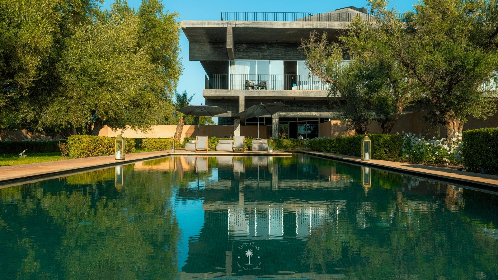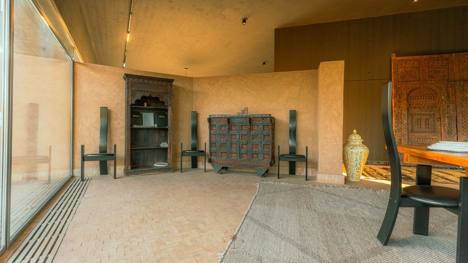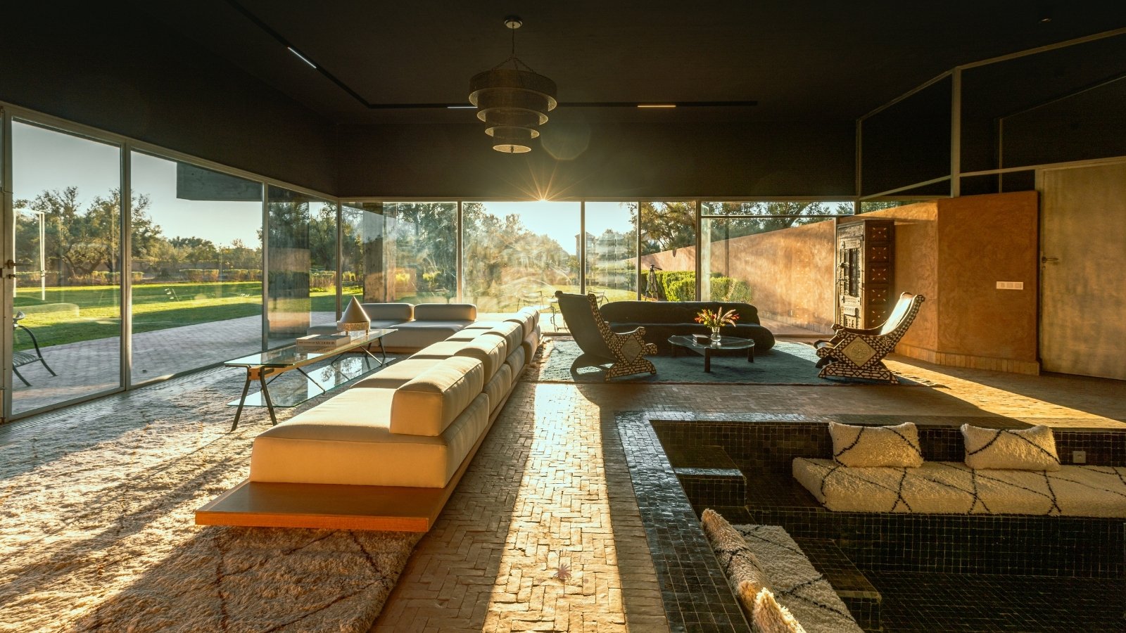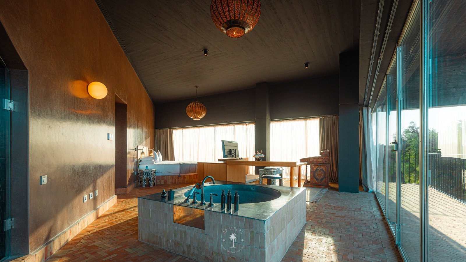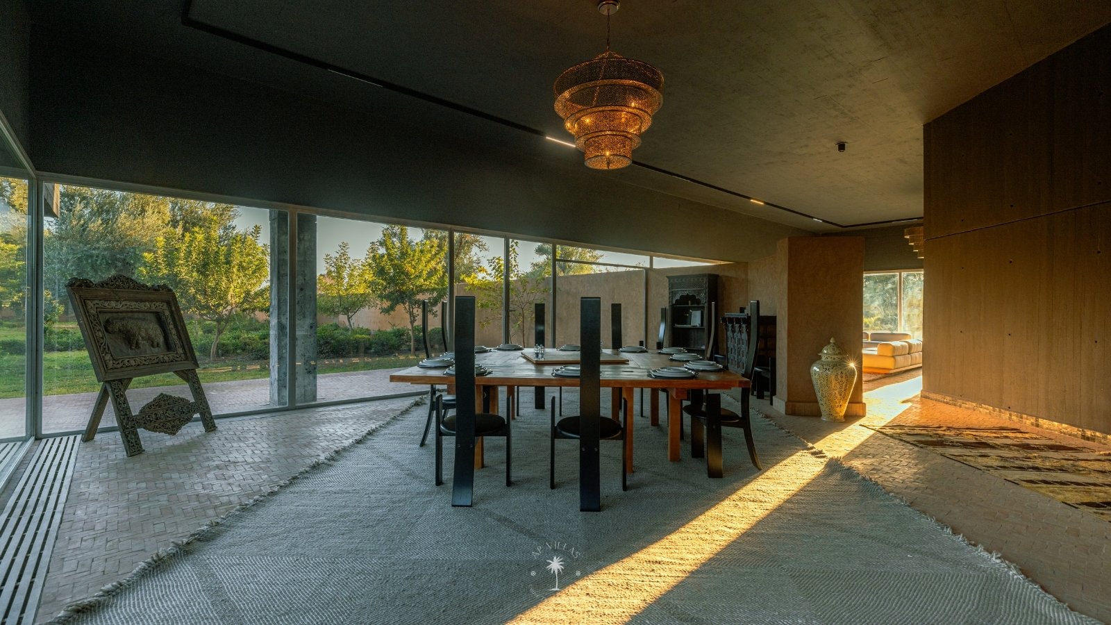 Designed with a north-facing orientation, the two-story Villa Quadin offers a thoughtfully curated sequence of living spaces. The first floor showcases a large, tent-like terrace, perfect for soaking in the stunning sunsets against the Atlas Mountains. It also houses the six airy, sunlit bedrooms, each master suite featuring circular bathtubs and en-suite bathrooms with walk-in showers. Each bedroom includes a dressing room and expansive terraces overlooking the four gardens, the majestic Atlas peaks, and the large swimming pool.