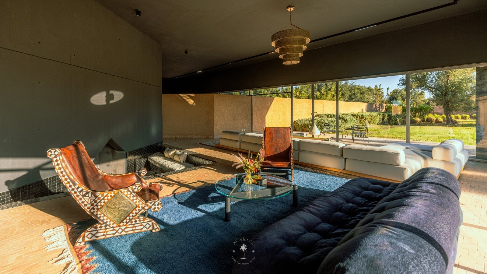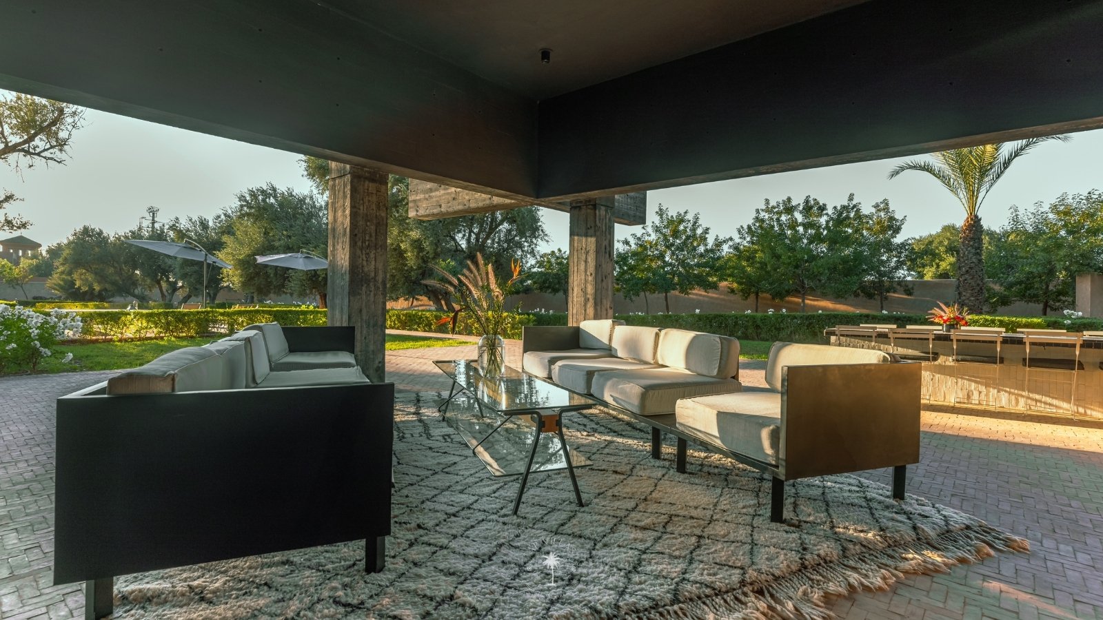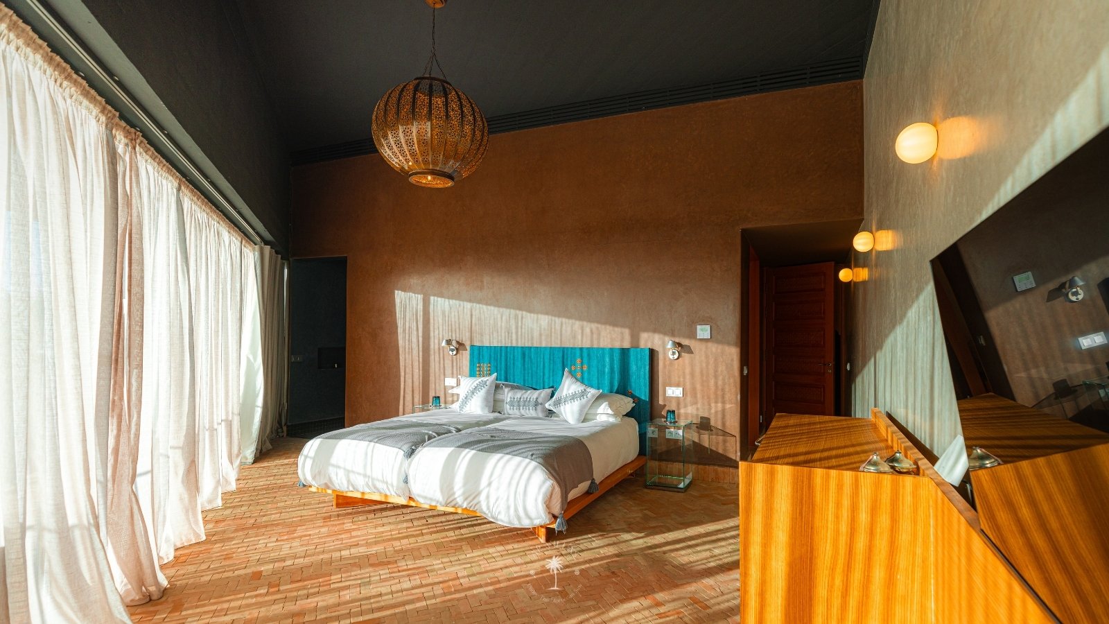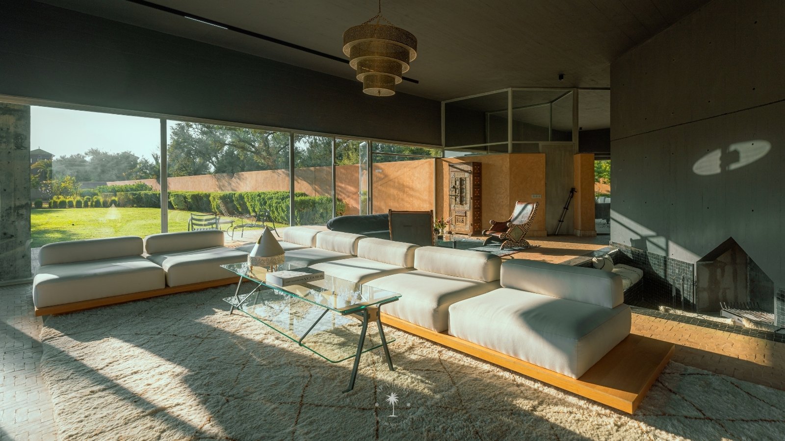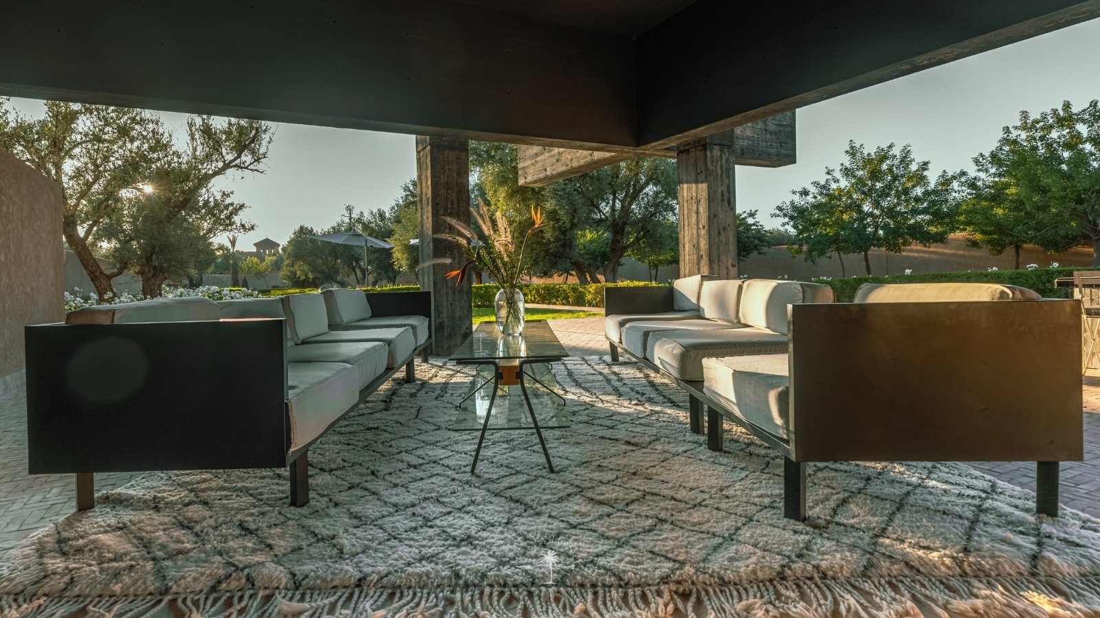 Designed with a north-facing orientation, the two-story Villa Quadin offers a thoughtfully curated sequence of living spaces. The first floor showcases a large, tent-like terrace, perfect for soaking in the stunning sunsets against the Atlas Mountains. It also houses the six airy, sunlit bedrooms, each master suite featuring circular bathtubs and en-suite bathrooms with walk-in showers. Each bedroom includes a dressing room and expansive terraces overlooking the four gardens, the majestic Atlas peaks, and the large swimming pool.