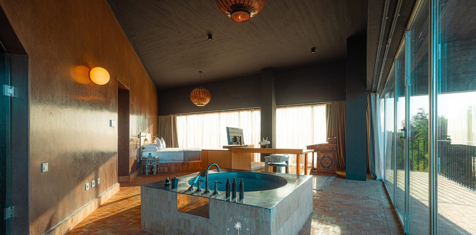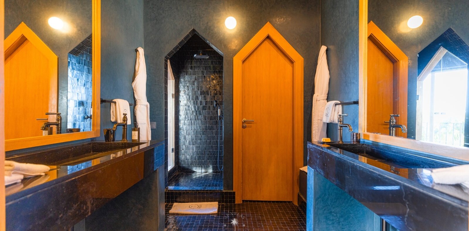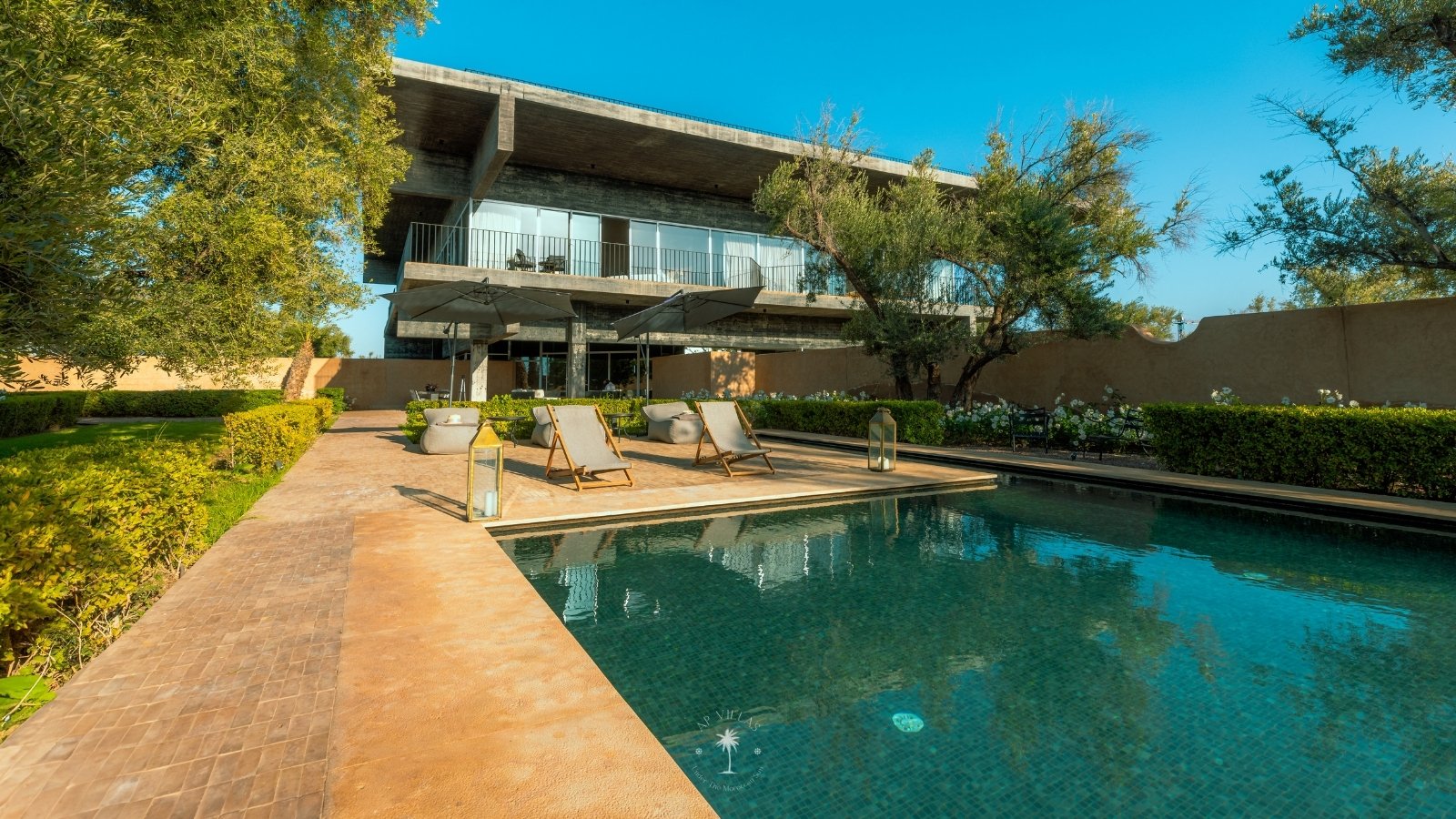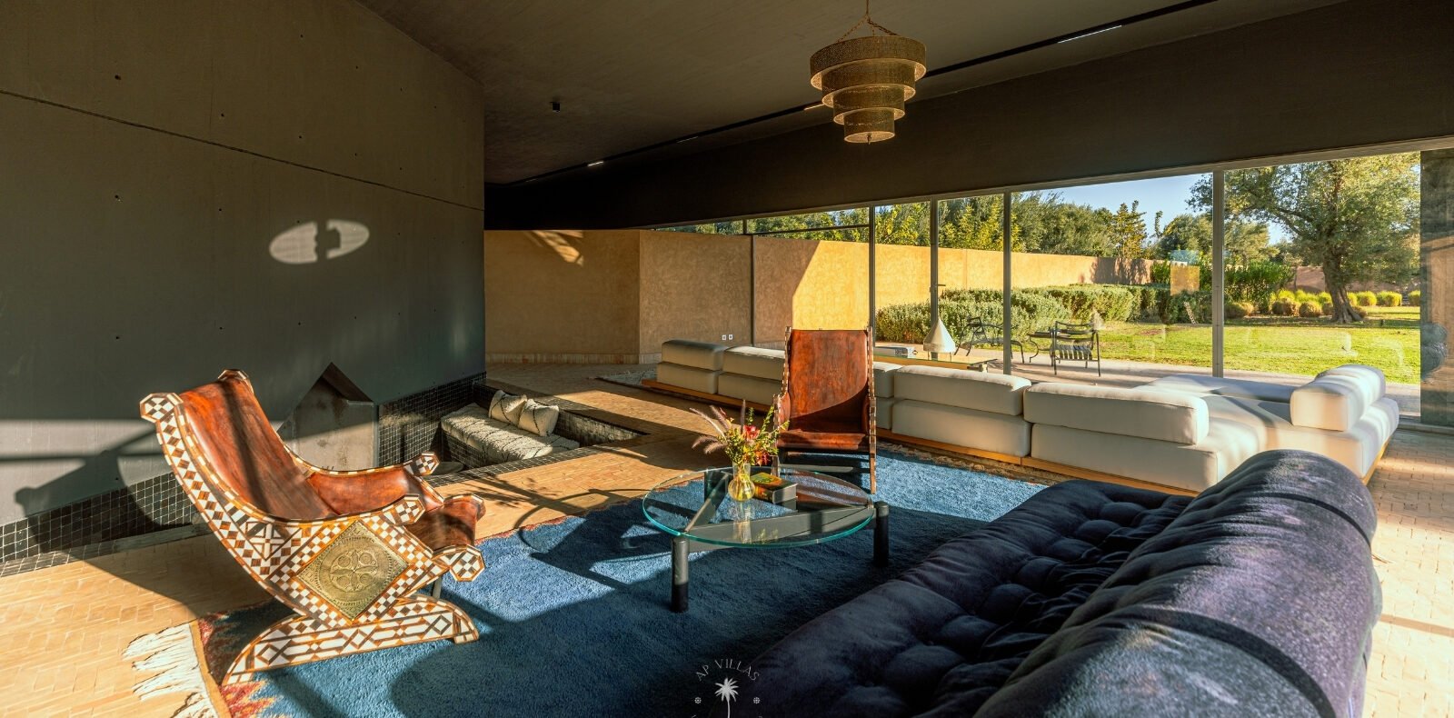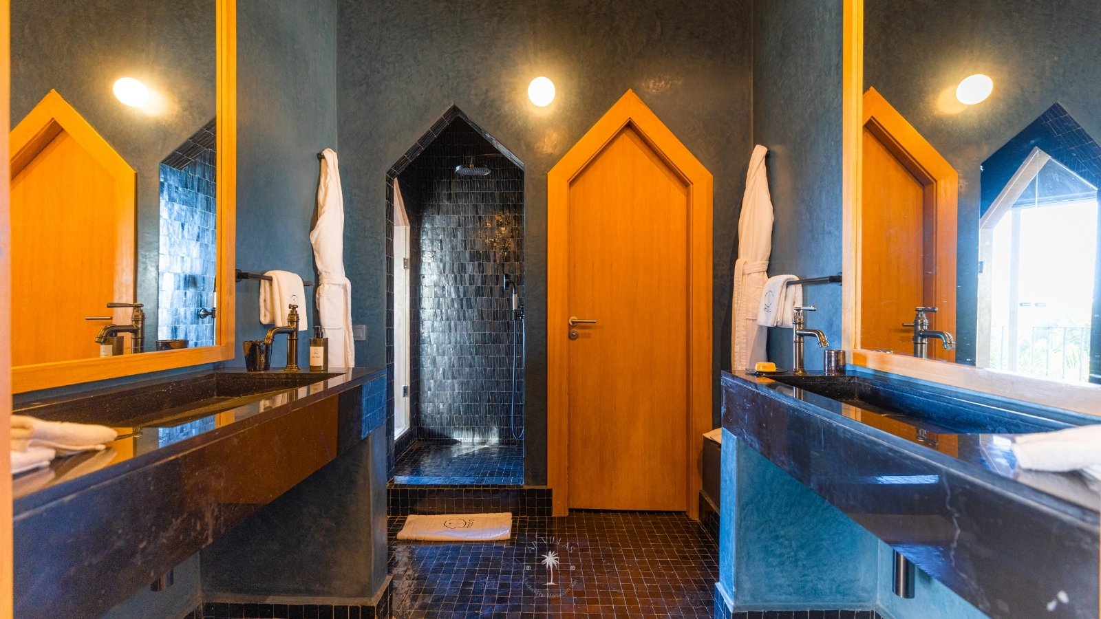 Designed with a north-facing orientation, the two-story Villa Quadin offers a thoughtfully curated sequence of living spaces. The first floor showcases a large, tent-like terrace, perfect for soaking in the stunning sunsets against the Atlas Mountains. It also houses the six airy, sunlit bedrooms, each master suite featuring circular bathtubs and en-suite bathrooms with walk-in showers. Each bedroom includes a dressing room and expansive terraces overlooking the four gardens, the majestic Atlas peaks, and the large swimming pool.