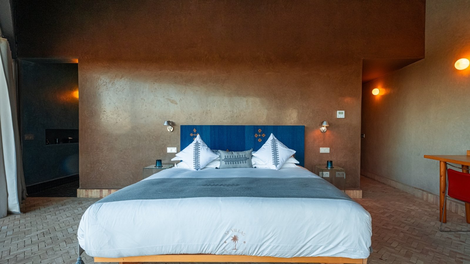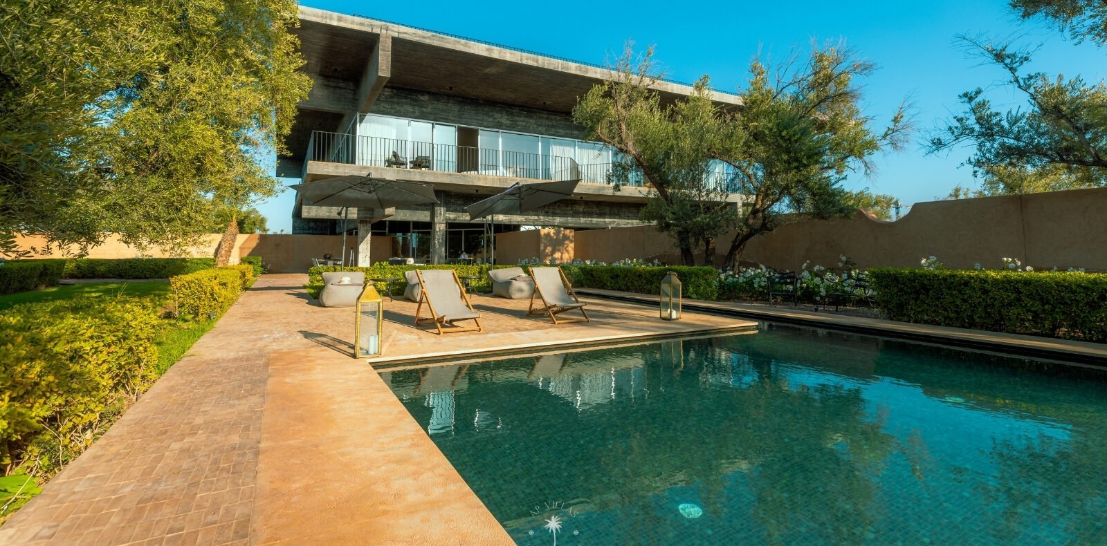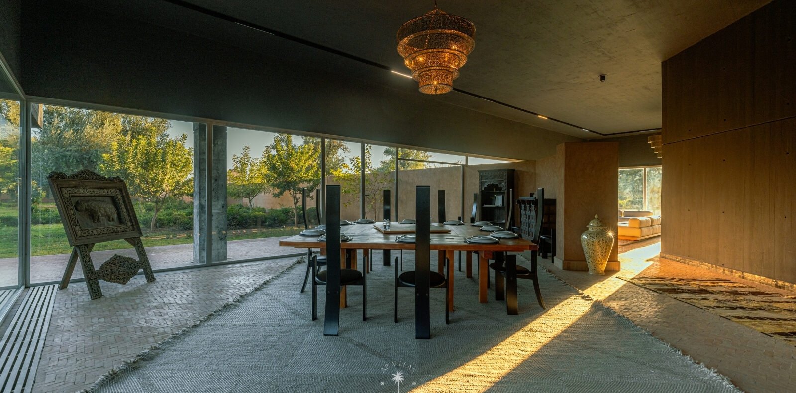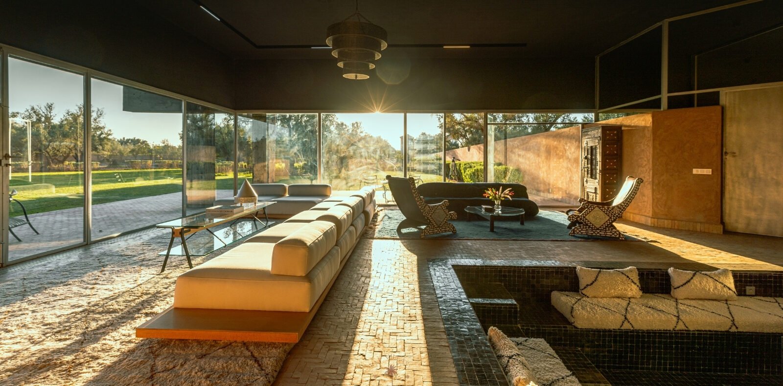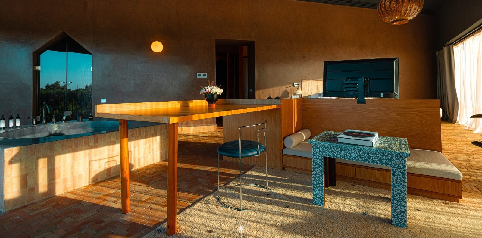 Designed with a north-facing orientation, the two-story Villa Quadin offers a thoughtfully curated sequence of living spaces. The first floor showcases a large, tent-like terrace, perfect for soaking in the stunning sunsets against the Atlas Mountains. It also houses the six airy, sunlit bedrooms, each master suite featuring circular bathtubs and en-suite bathrooms with walk-in showers. Each bedroom includes a dressing room and expansive terraces overlooking the four gardens, the majestic Atlas peaks, and the large swimming pool.