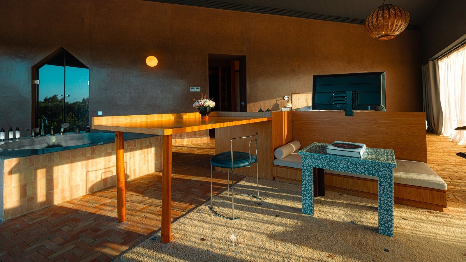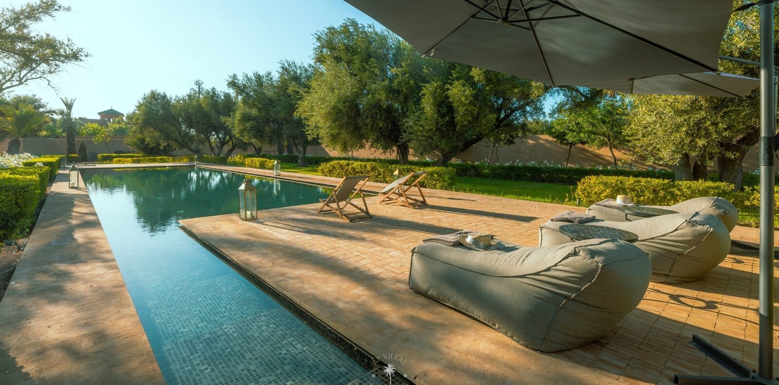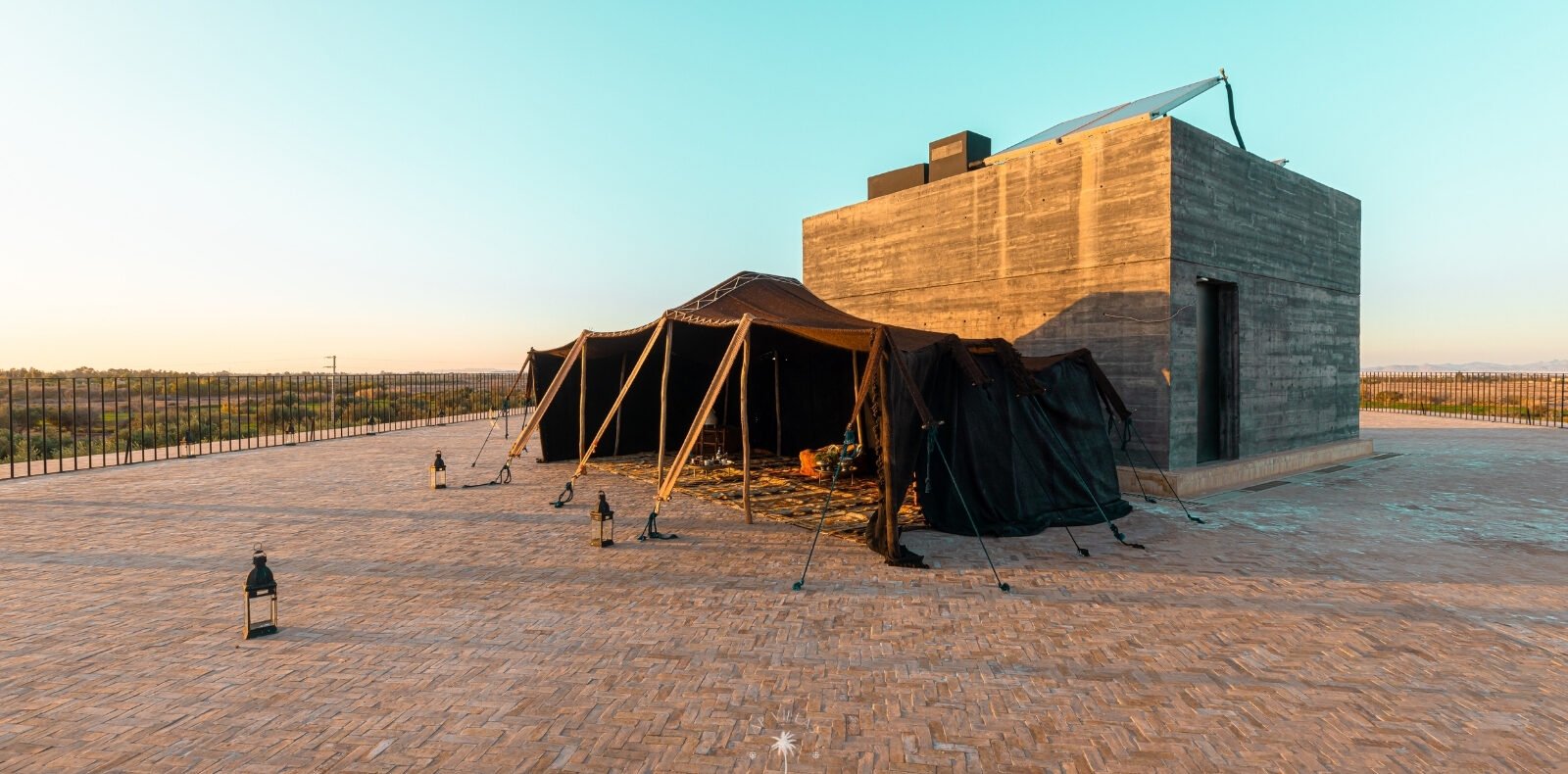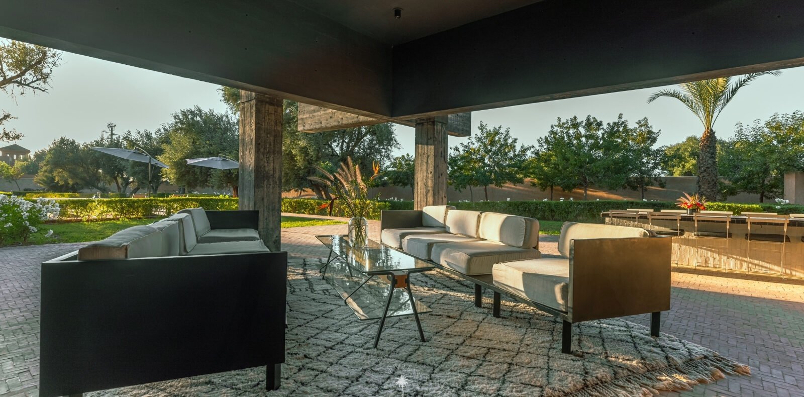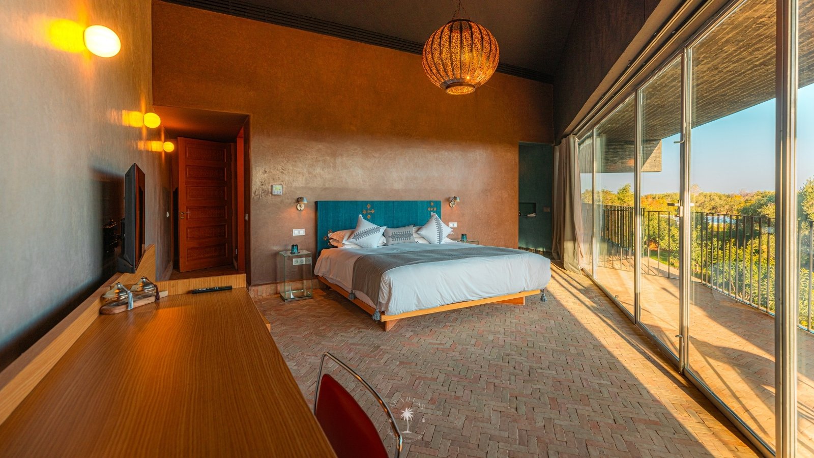 Designed with a north-facing orientation, the two-story Villa Quadin offers a thoughtfully curated sequence of living spaces. The first floor showcases a large, tent-like terrace, perfect for soaking in the stunning sunsets against the Atlas Mountains. It also houses the six airy, sunlit bedrooms, each master suite featuring circular bathtubs and en-suite bathrooms with walk-in showers. Each bedroom includes a dressing room and expansive terraces overlooking the four gardens, the majestic Atlas peaks, and the large swimming pool.