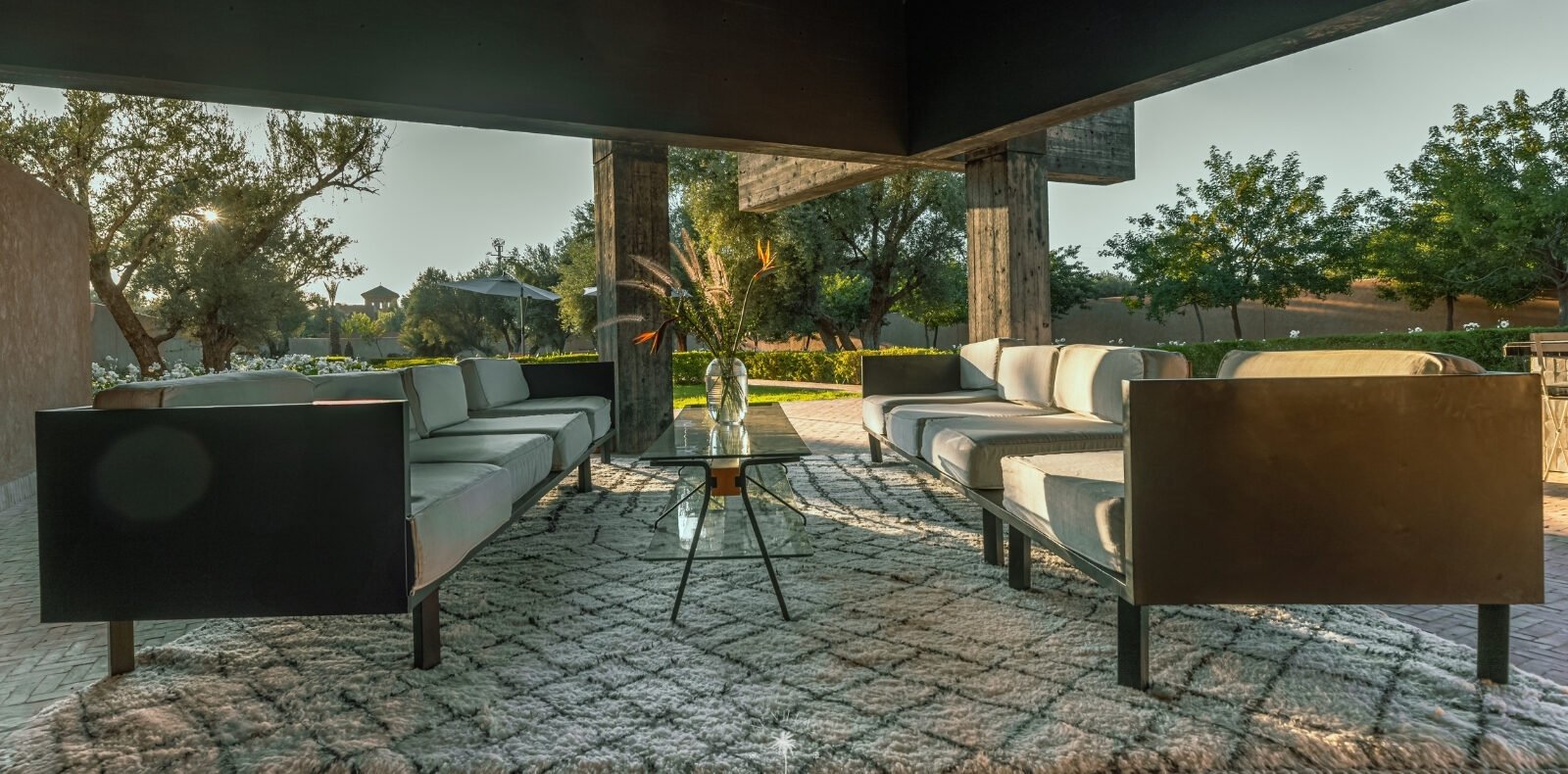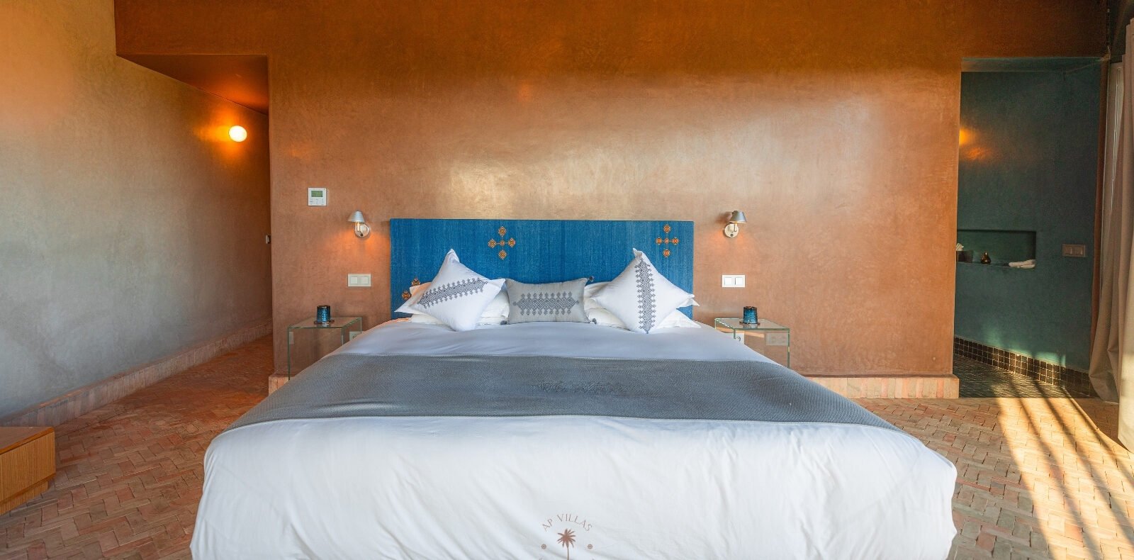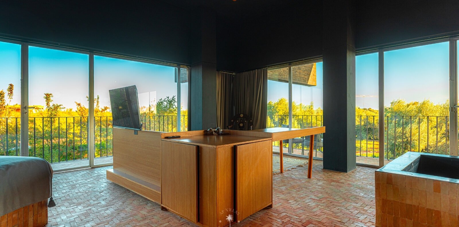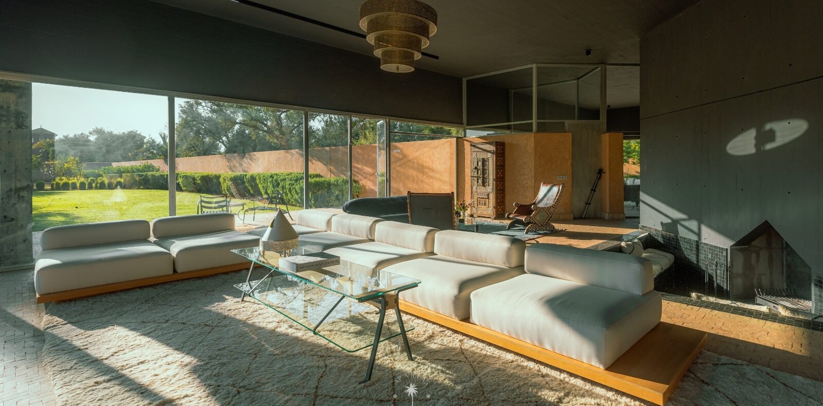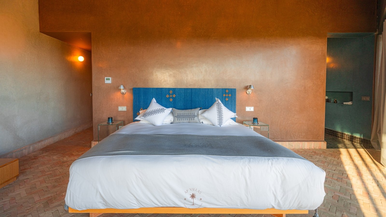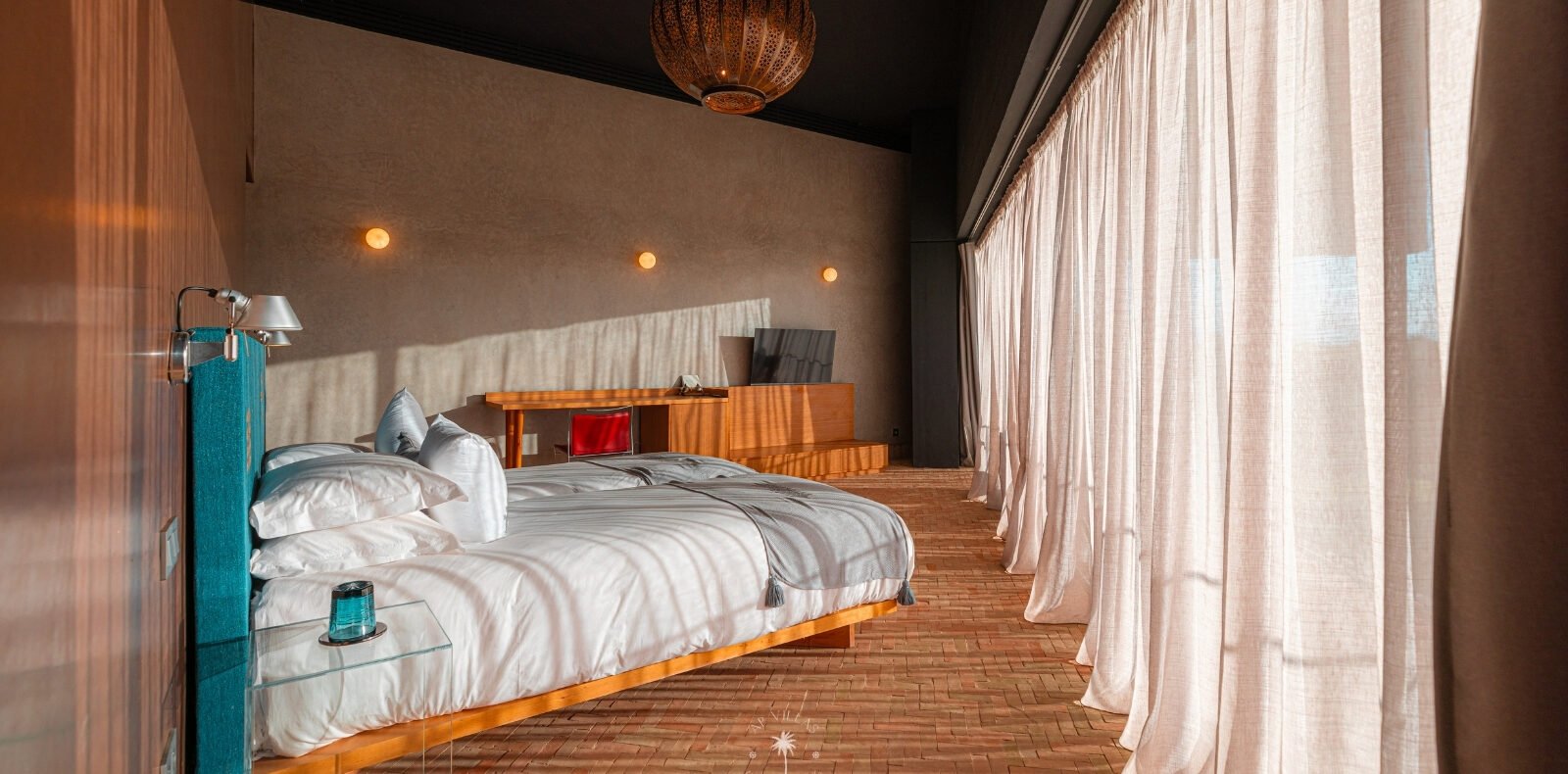 Designed with a north-facing orientation, the two-story Villa Quadin offers a thoughtfully curated sequence of living spaces. The first floor showcases a large, tent-like terrace, perfect for soaking in the stunning sunsets against the Atlas Mountains. It also houses the six airy, sunlit bedrooms, each master suite featuring circular bathtubs and en-suite bathrooms with walk-in showers. Each bedroom includes a dressing room and expansive terraces overlooking the four gardens, the majestic Atlas peaks, and the large swimming pool.