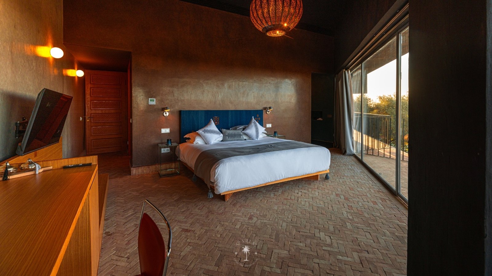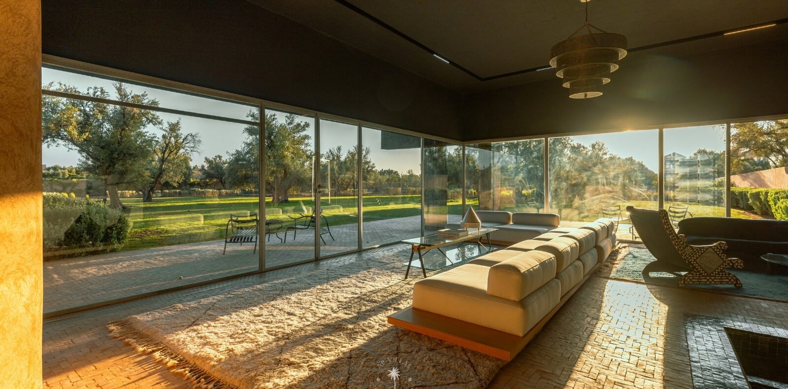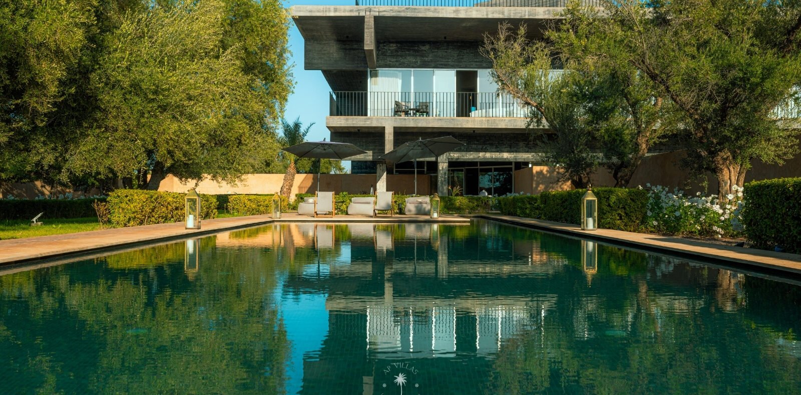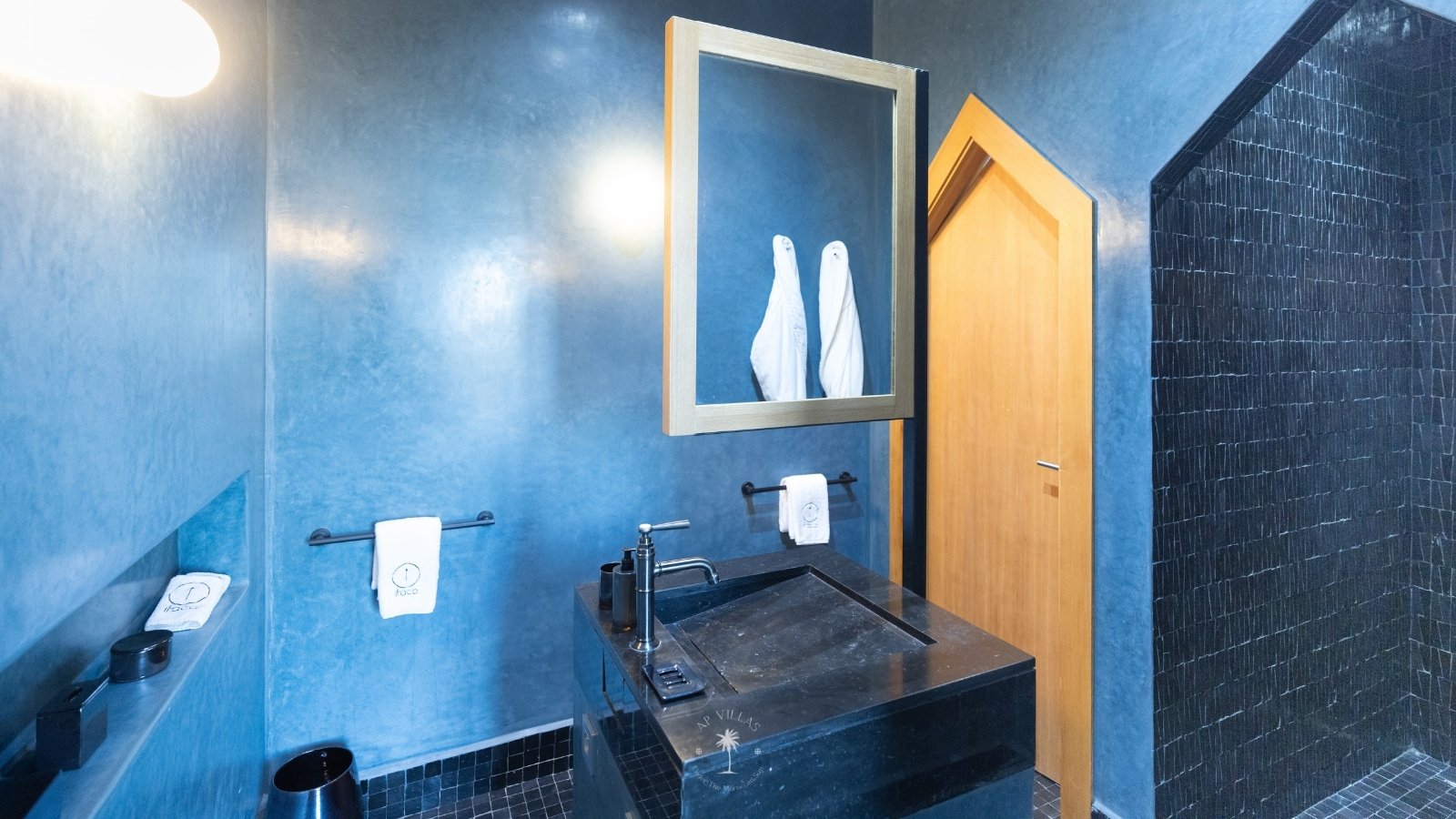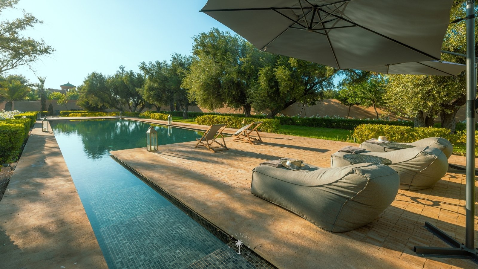 Designed with a north-facing orientation, the two-story Villa Quadin offers a thoughtfully curated sequence of living spaces. The first floor showcases a large, tent-like terrace, perfect for soaking in the stunning sunsets against the Atlas Mountains. It also houses the six airy, sunlit bedrooms, each master suite featuring circular bathtubs and en-suite bathrooms with walk-in showers. Each bedroom includes a dressing room and expansive terraces overlooking the four gardens, the majestic Atlas peaks, and the large swimming pool.