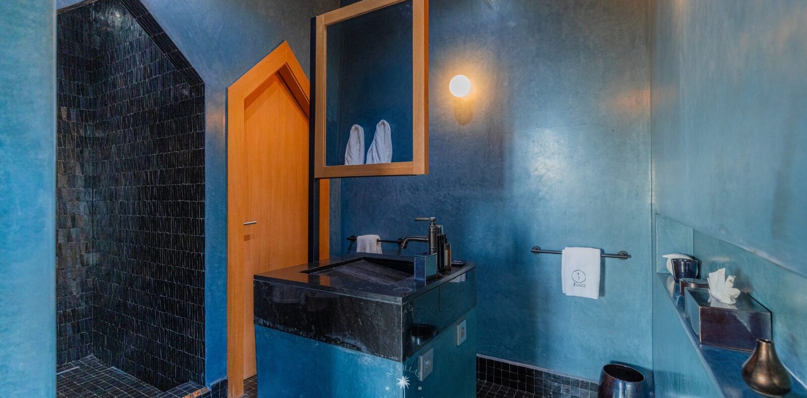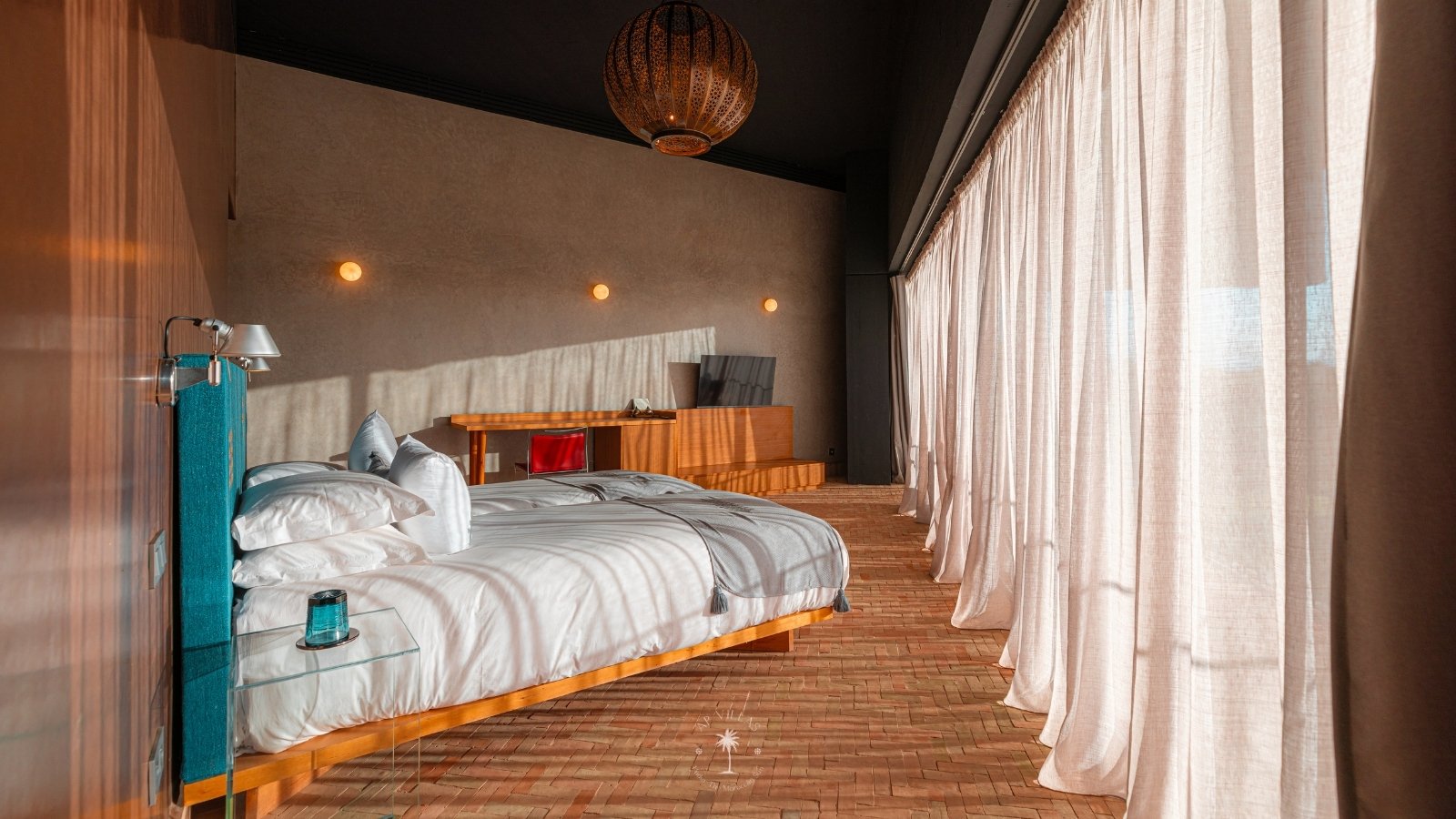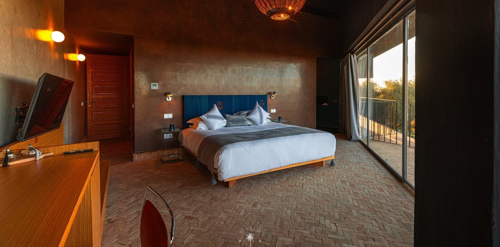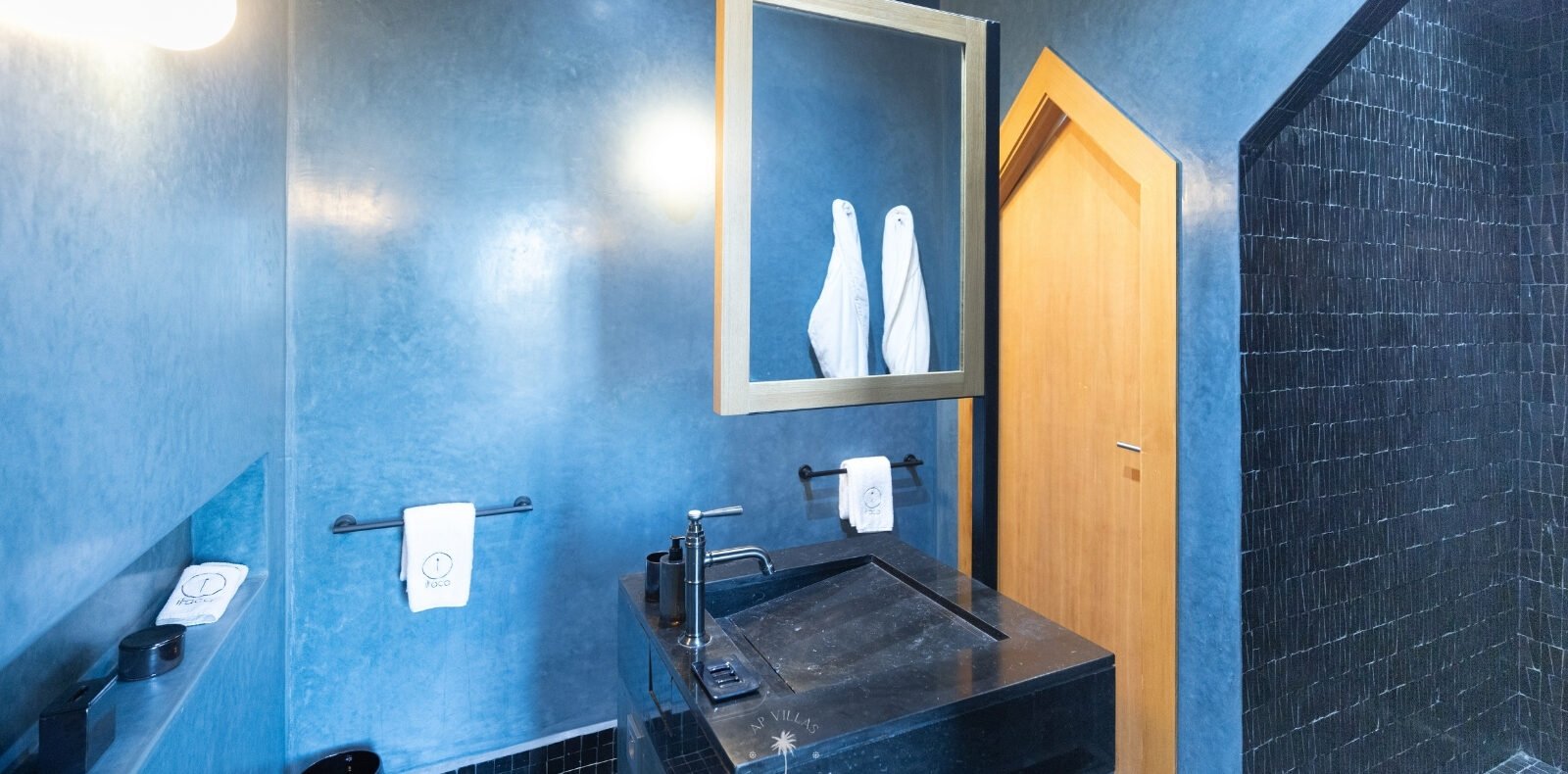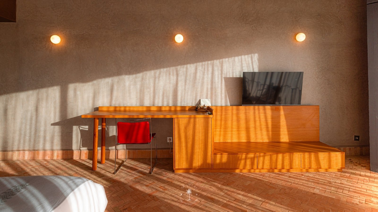 Designed with a north-facing orientation, the two-story Villa Quadin offers a thoughtfully curated sequence of living spaces. The first floor showcases a large, tent-like terrace, perfect for soaking in the stunning sunsets against the Atlas Mountains. It also houses the six airy, sunlit bedrooms, each master suite featuring circular bathtubs and en-suite bathrooms with walk-in showers. Each bedroom includes a dressing room and expansive terraces overlooking the four gardens, the majestic Atlas peaks, and the large swimming pool.