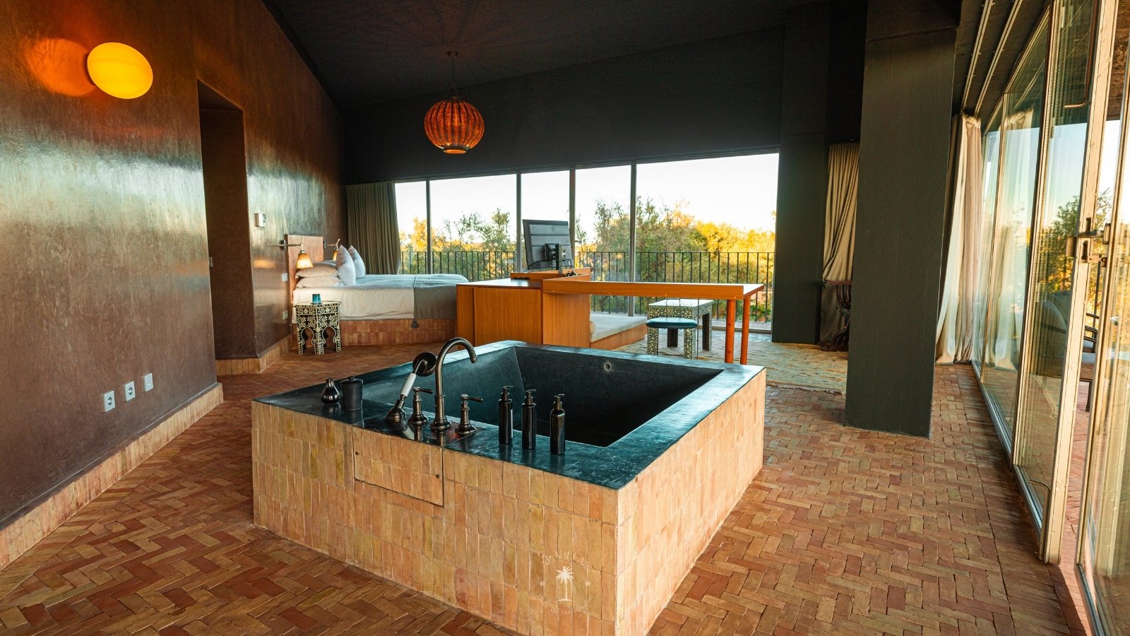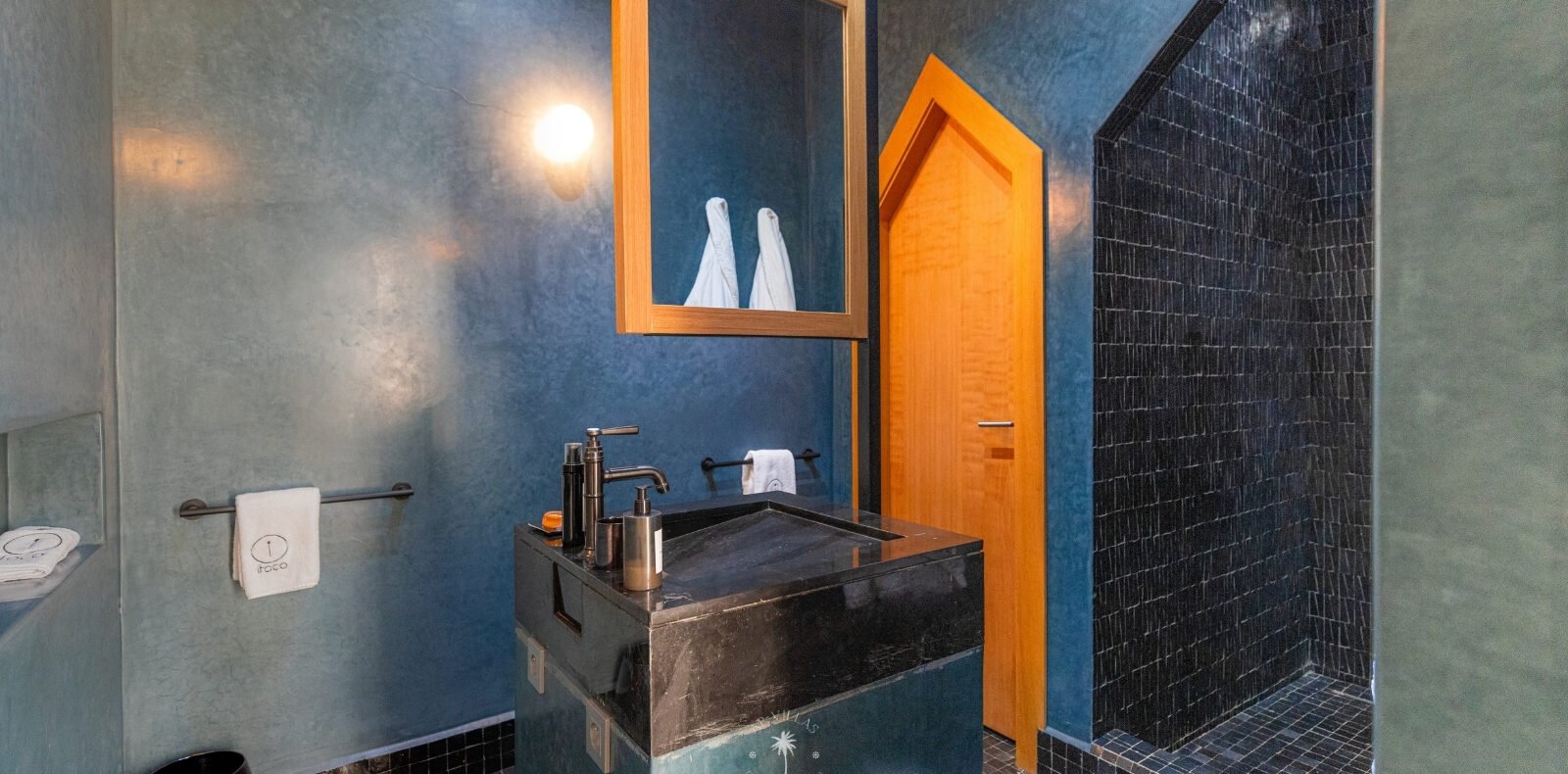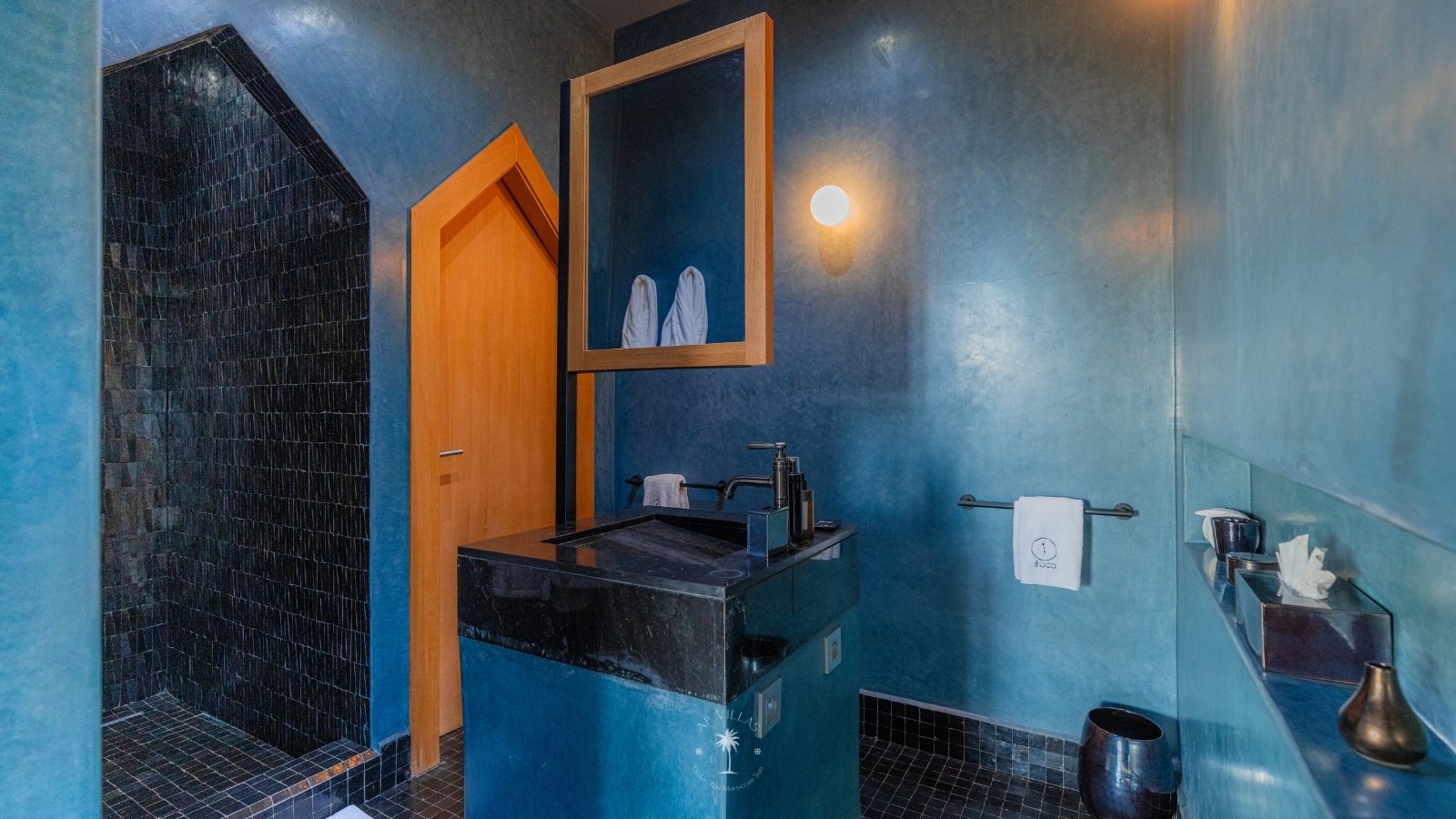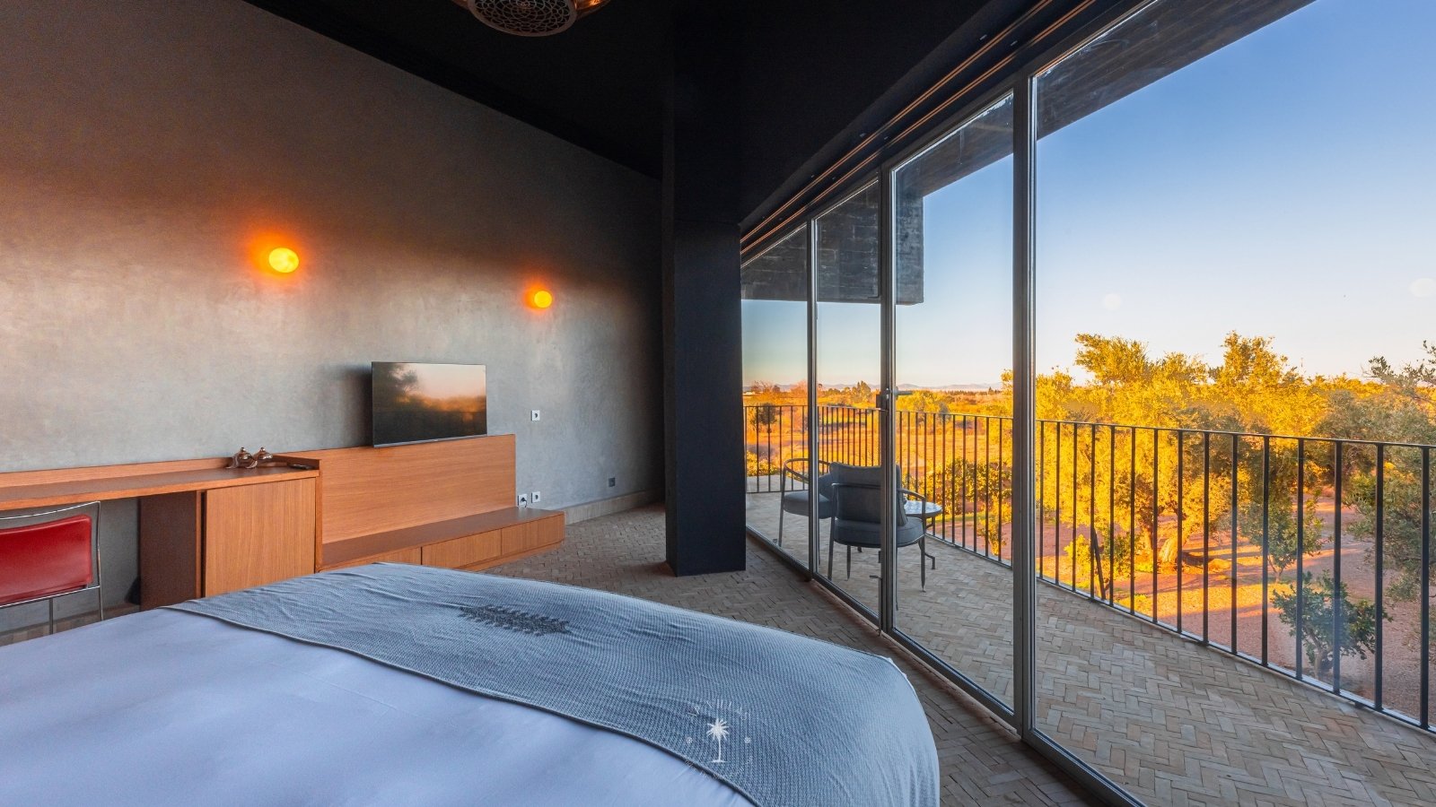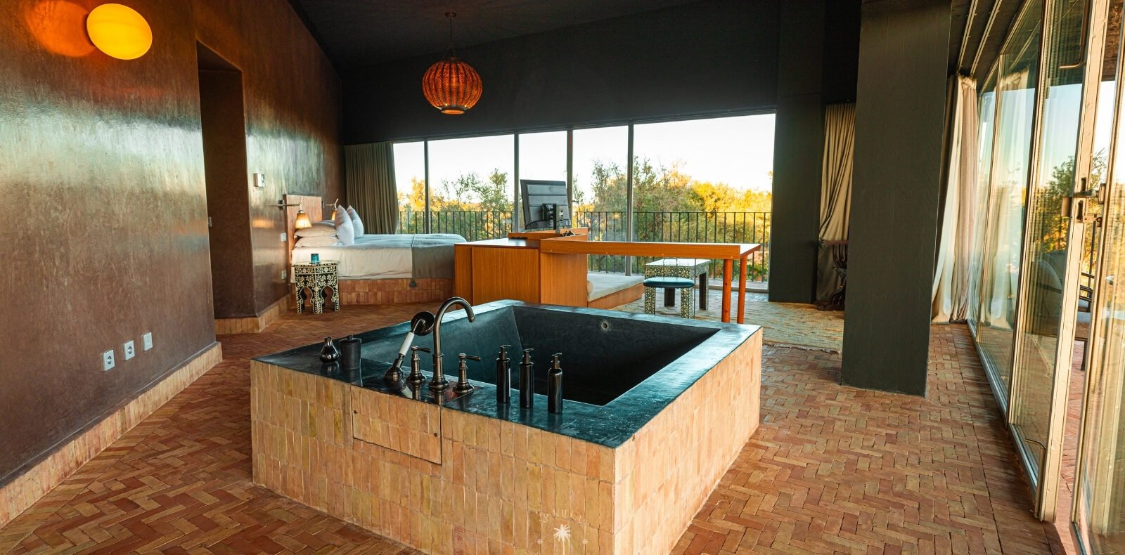 Designed with a north-facing orientation, the two-story Villa Quadin offers a thoughtfully curated sequence of living spaces. The first floor showcases a large, tent-like terrace, perfect for soaking in the stunning sunsets against the Atlas Mountains. It also houses the six airy, sunlit bedrooms, each master suite featuring circular bathtubs and en-suite bathrooms with walk-in showers. Each bedroom includes a dressing room and expansive terraces overlooking the four gardens, the majestic Atlas peaks, and the large swimming pool.