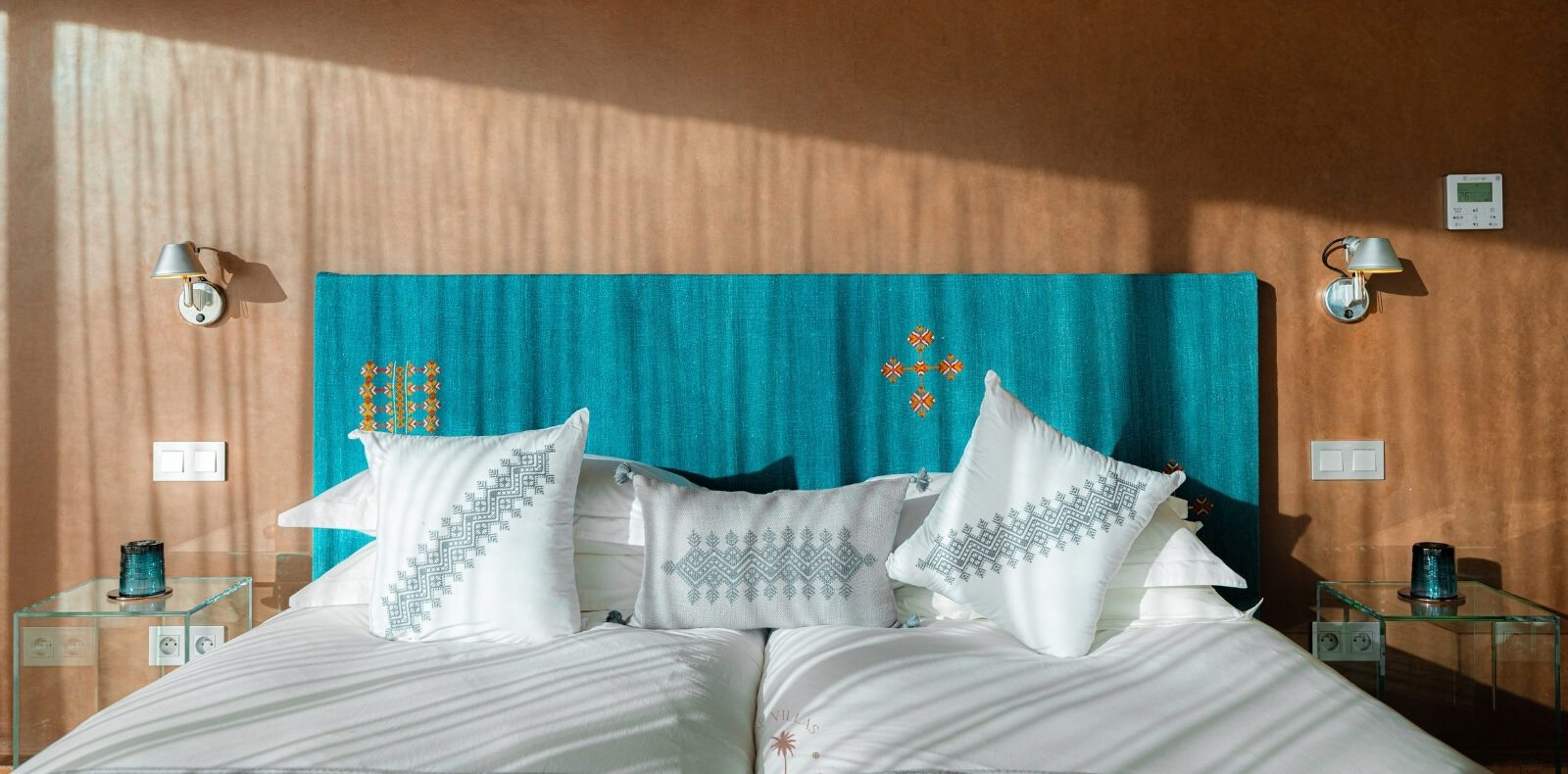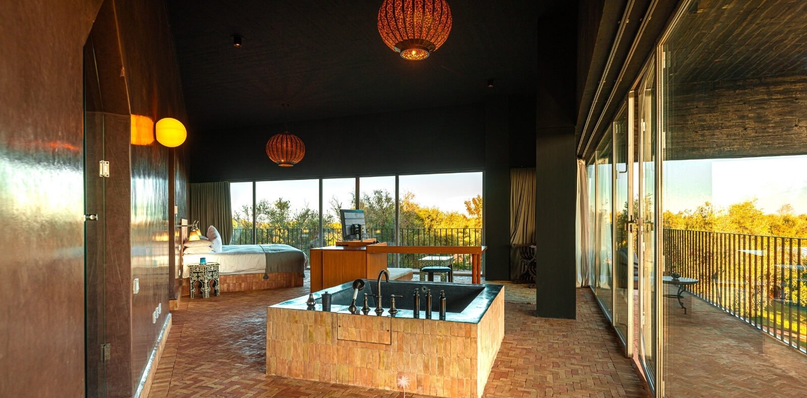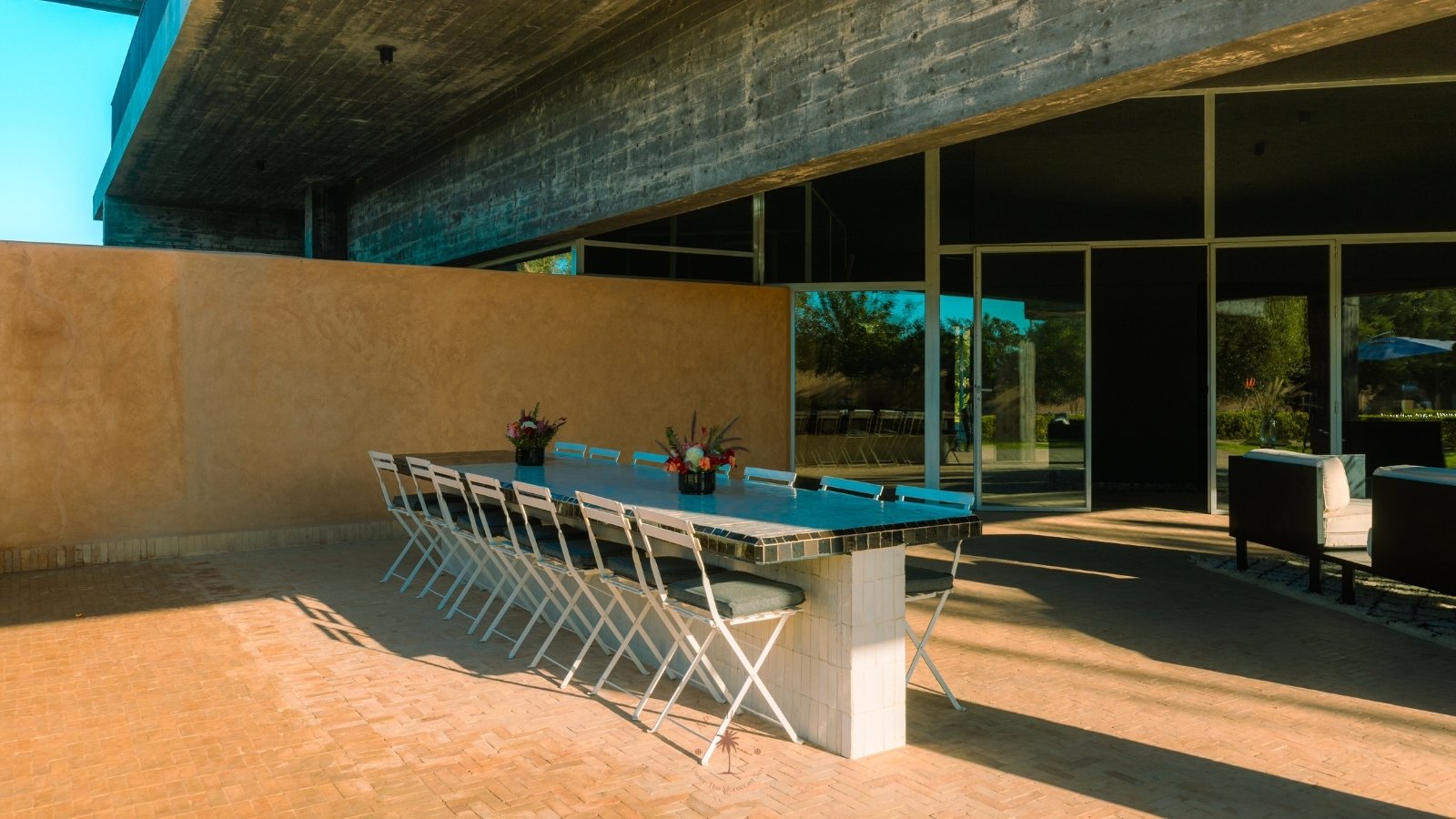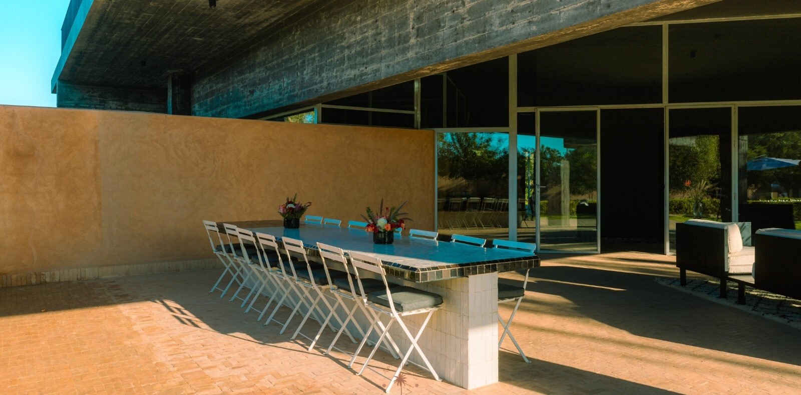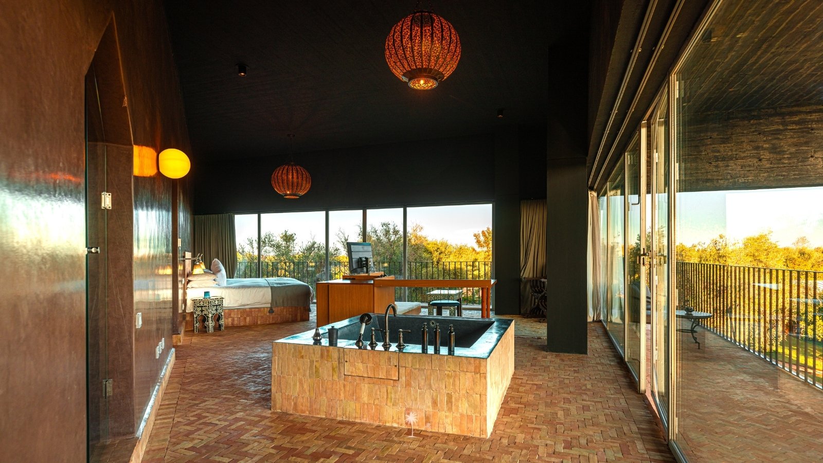 Designed with a north-facing orientation, the two-story Villa Quadin offers a thoughtfully curated sequence of living spaces. The first floor showcases a large, tent-like terrace, perfect for soaking in the stunning sunsets against the Atlas Mountains. It also houses the six airy, sunlit bedrooms, each master suite featuring circular bathtubs and en-suite bathrooms with walk-in showers. Each bedroom includes a dressing room and expansive terraces overlooking the four gardens, the majestic Atlas peaks, and the large swimming pool.