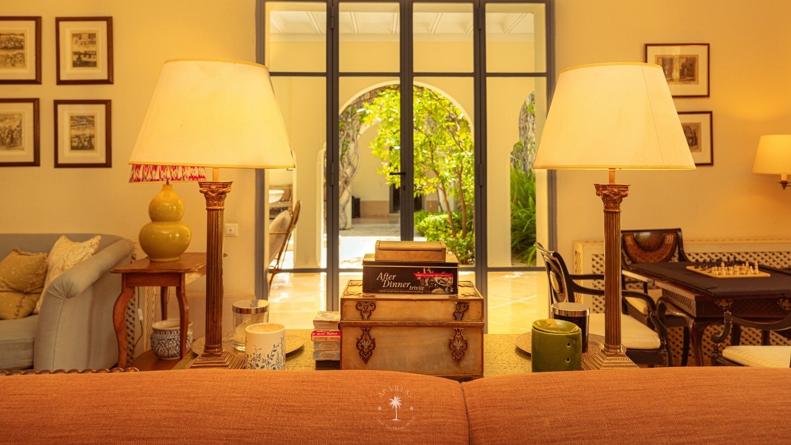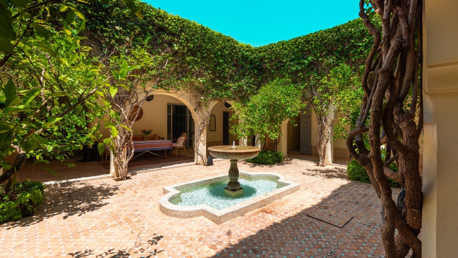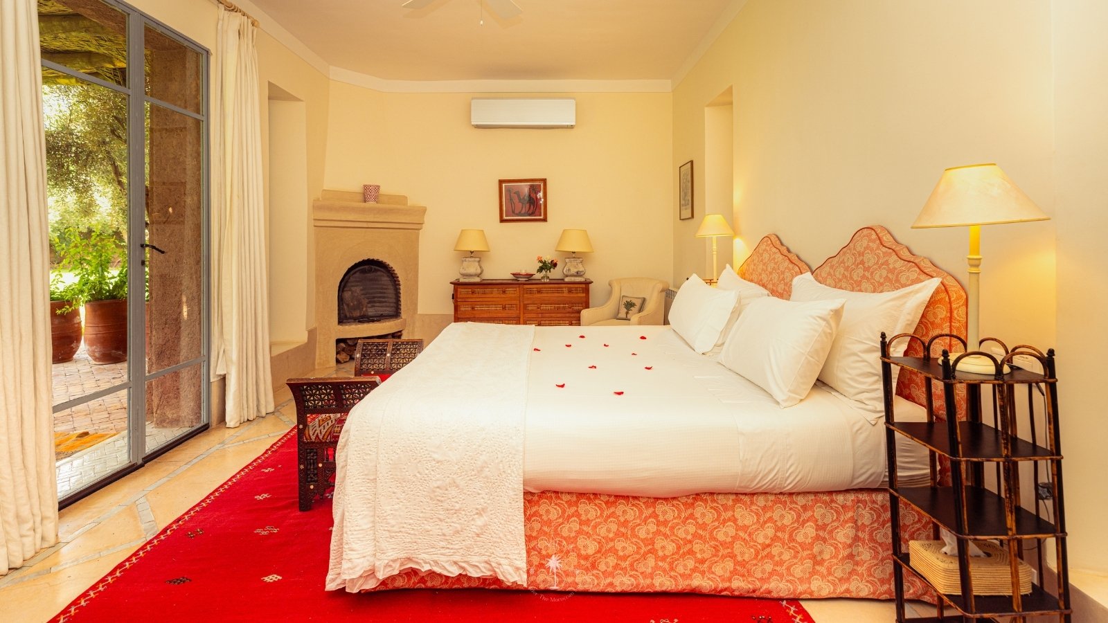 The property features five suites, each with its own bathroom and dressing area, as well as a terrace, with three suites overlooking the serene patio. Additional spaces include a cozy living room with a fireplace, a dining room, and a TV room.