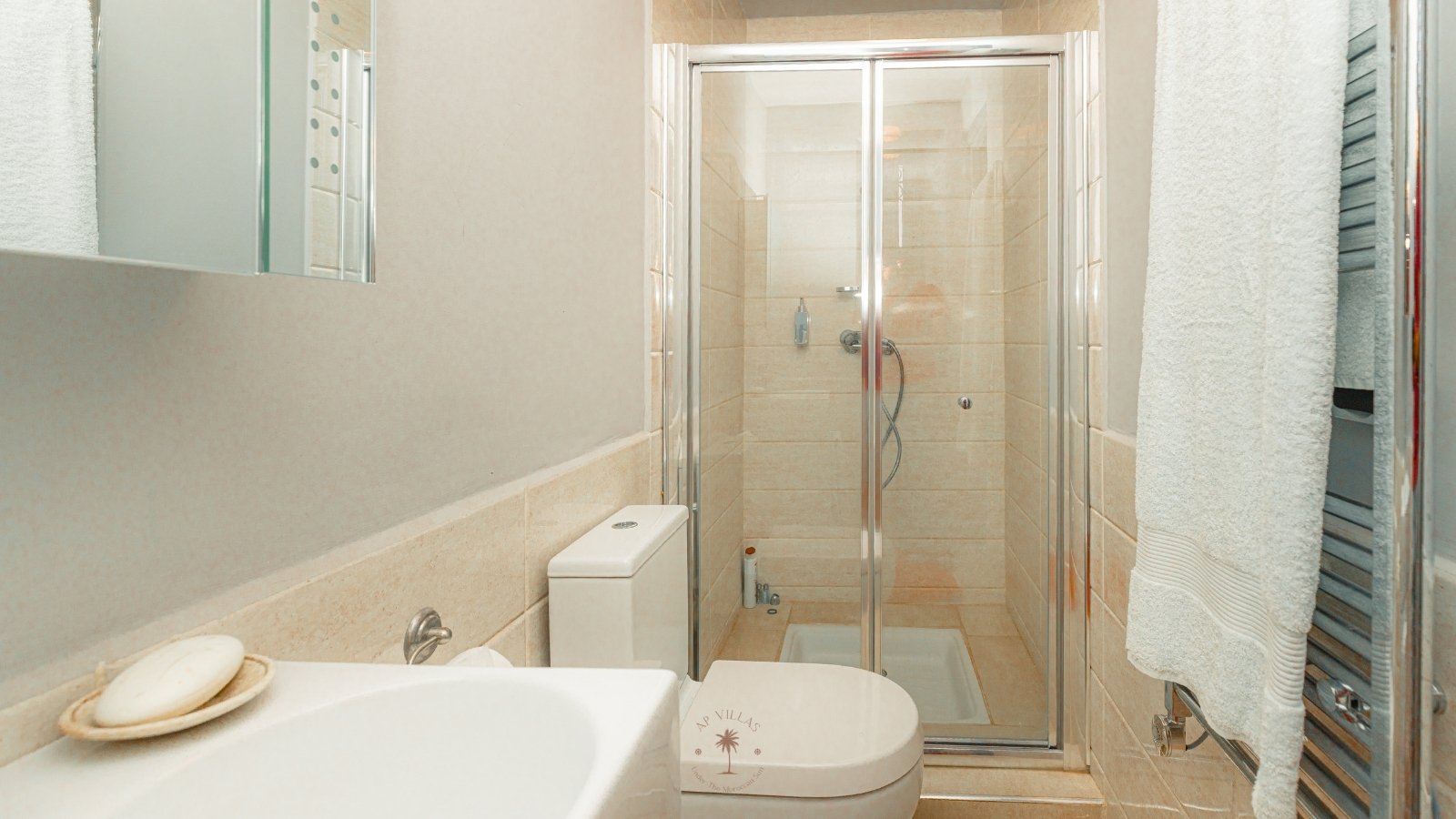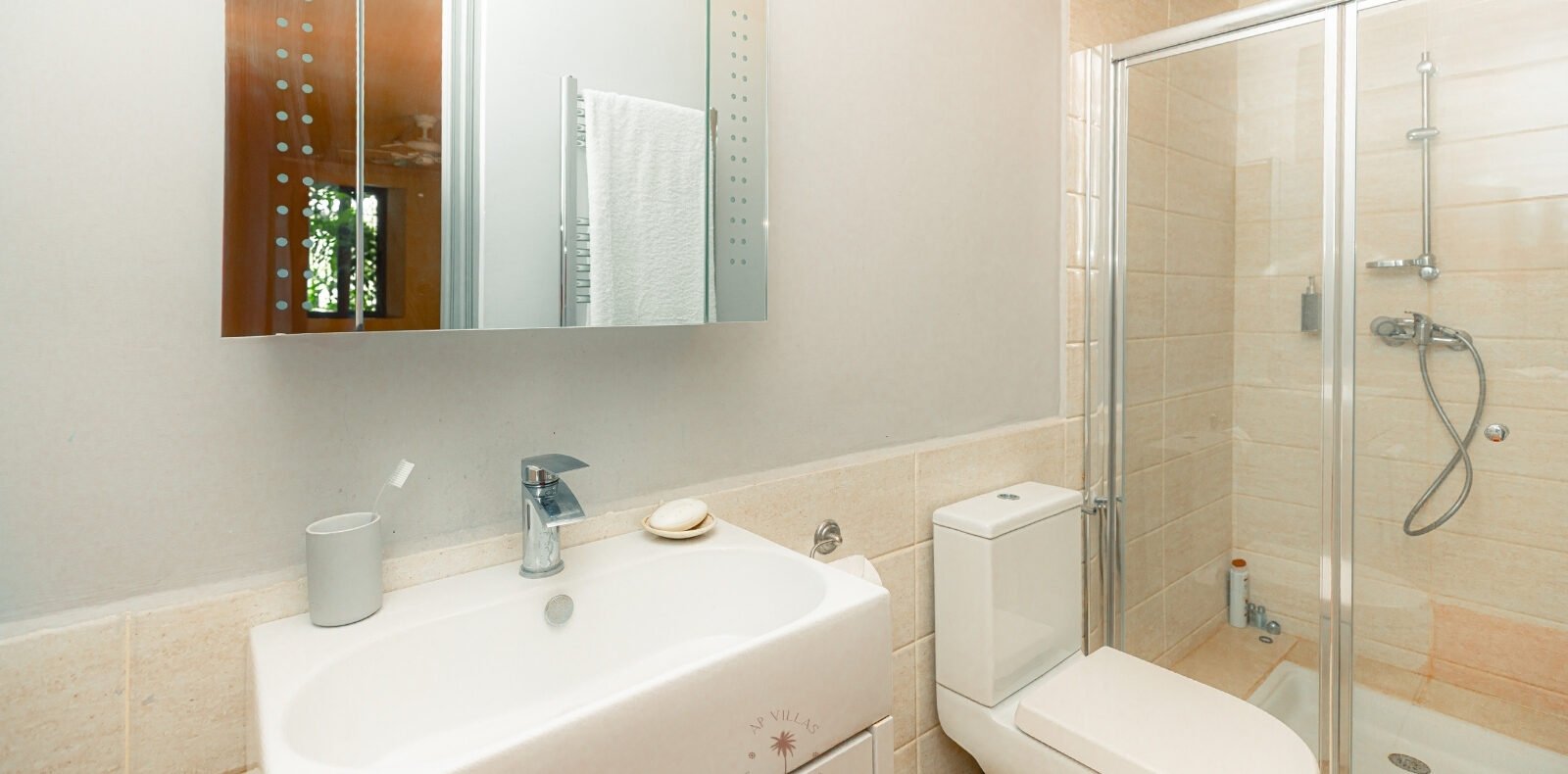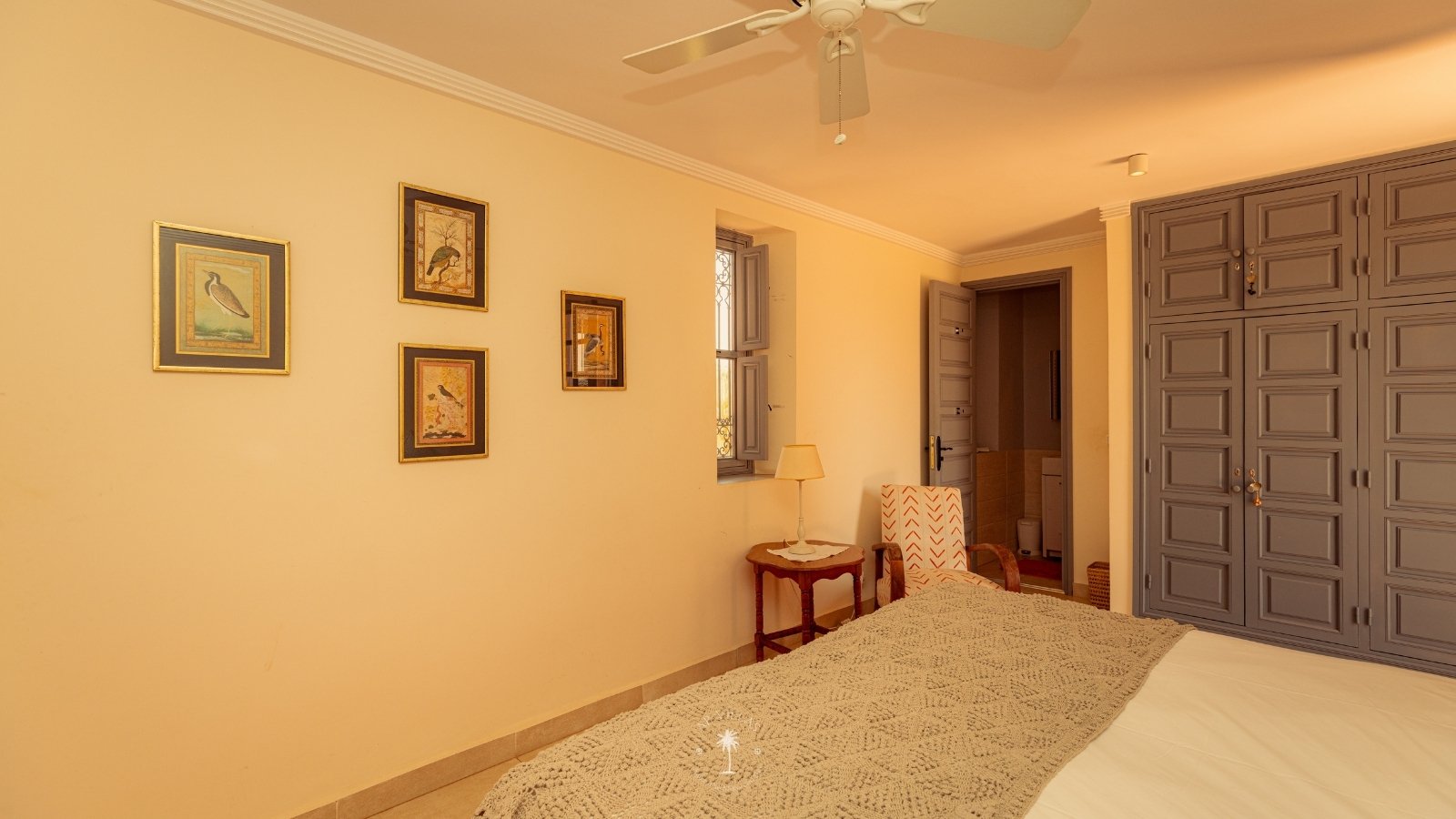 The property features five suites, each with its own bathroom and dressing area, as well as a terrace, with three suites overlooking the serene patio. Additional spaces include a cozy living room with a fireplace, a dining room, and a TV room.